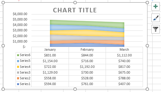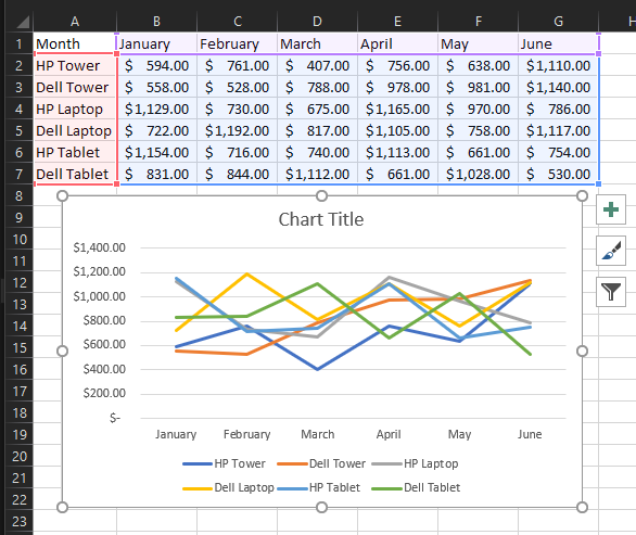For instance, we have total sales of products over a six month period. To display a line chart follow these steps: