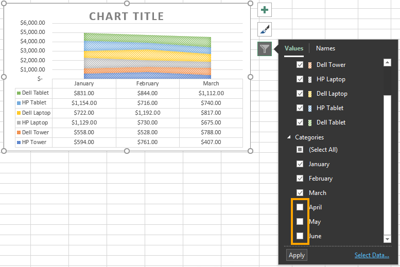 Select the chart and click the Chart Filters menu button. Here you can uncheck the data categories you want to remove. In our case, we want to remove April, May, and June out of the chart. Click Apply when you are done.