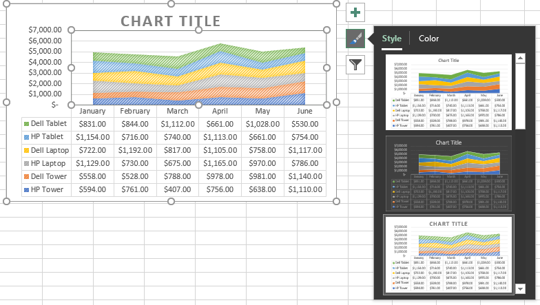 As you hover your mouse over the various styles and colors, you can preview of how your chart would look. Click when you see one you like.