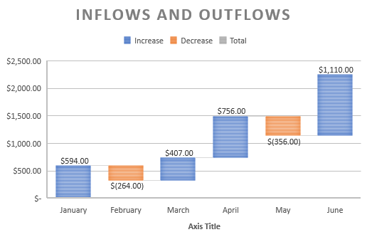 In comparison to other charts in this article, waterfall charts might not be as popular, but it is a very useful chart type when it comes to visualizing increases and decreases in financial datasets. There’s only one type of waterfall chart in Excel, however, it's appearance is still customizable in the same way as other charts.