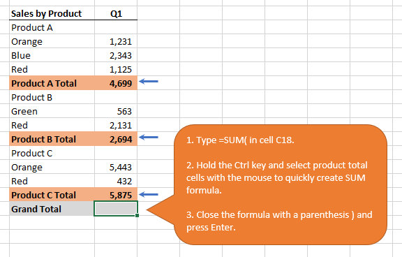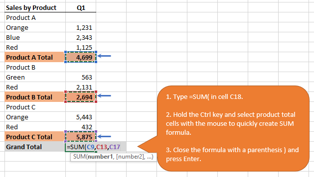 The problem is that typing this formula can take considerable time and be more prone to a mistake, particularly if you have a lot of subtotal rows to sum up. The fastest way to produce this formula is to hold down the Ctrl key and select the cells you want to include by left-clicking the cells with the mouse.