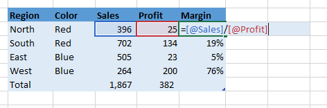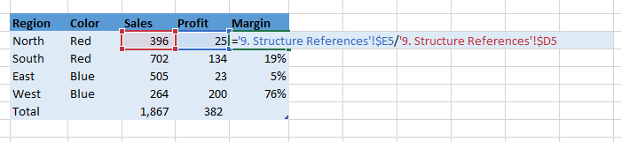 As you can see in the image below, the structured reference syntax uses column names instead of cell addresses. If this cell was not in a table, the formula would read =E5/D5