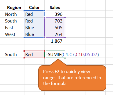 - For auditing, press the F2 key on the cell containing the formula and see what cells are being referenced in the formula with the help of the colored boxes.