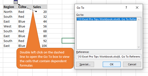 By double-clicking on the black arrow line you will be sent to the Go To box. (Make sure you click on the black dashed line between the selected cell and the spreadsheet icon to get the Go To box.)