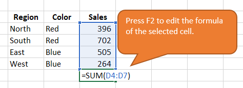 - For editing, just select any cell that contains a formula and press the F2 key. This opens the formula for editing directly in the cell, without having to use the mouse. The F2 equivalent on the Mac is Ctrl+U.