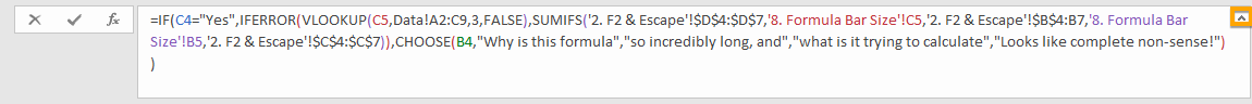 When your formula gets very long, you can expand the height of the Formula Bar. This a simple quick tip, but it can be really helpful when viewing large formulas.