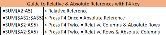 The ScreenTip link can further be used to quickly change the cell reference between absolute and relative. For the F4 key to work, the cursor must be placed inside the reference or the cell reference must be selected.