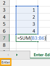Enter Mode – Enter mode is used for referencing cells or ranges in your formula. Clicking the arrow keys on the keyboard will choose cells in the worksheet and add to the selected cell in the formula. This is the mode that can be annoying if you are just trying to move the cursor within your formula.