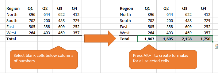 - Create formulas in multiple cells at the same time by selecting a row of blank cells below your data and press Alt+=. The sum formulas will be created in all of the blank selected cells that are below a column or to the right of a row of numbers. This makes creating the formulas even faster.