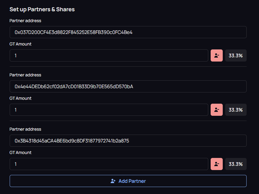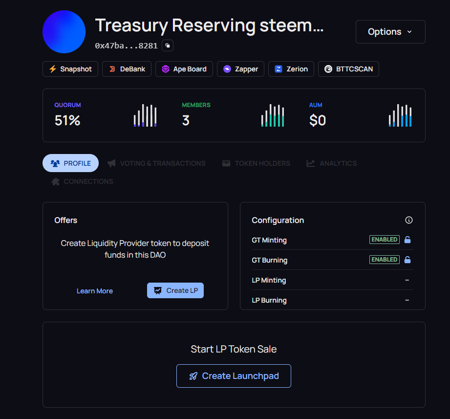 거버넌스 토큰과 파트너를 설정합니다.다오의 멀티시그로 거버넌스를 결정한다고 보시면 되겠네요. 희안하게도 거버넌스토큰과 LP토큰이 분리되어 있습니다. 거버넌스와 투자는 따로입니다.