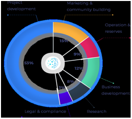The funds generated will be properly utilized as 53% of it will be for the development of the project and 15% will be allocated for marketing and community building purpose, also 12% will be for business development and 9% will be kept for operation and reserve, research will take care of 8% of the generated funds and finally 3% will be for legal and compliance purpose. As shown in the diagram below