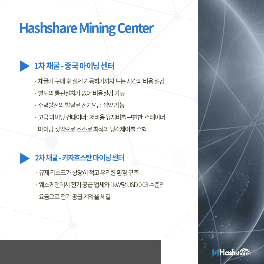 해시쉐어 팀은 1차 채굴을 중국 사천에서 진행하고 있으며, 현시점 가성비가 높은 신형과 중고 채굴 장비로 비트코인 채굴을 이어가고 있다고 합니다. 중국에서 1차 채굴을 하는 이유는 장비의 결함이 발생해 수리가 필요한 경우 6 개월 내로 무상교환을 할 수 있기 때문에 채굴기의 운반에 드는 시간과 비용을 줄여 채산성을 높이기 위해서라고하며, 중국에서 A/S 무상기간이 끝난 채굴 장비는 현시점 채굴장 운영에 최적의 환경으로 평가받는 카자흐스탄으로 옮겨 2차 채굴센터에서 본격적으로 가동할 예정이라고 합니다.