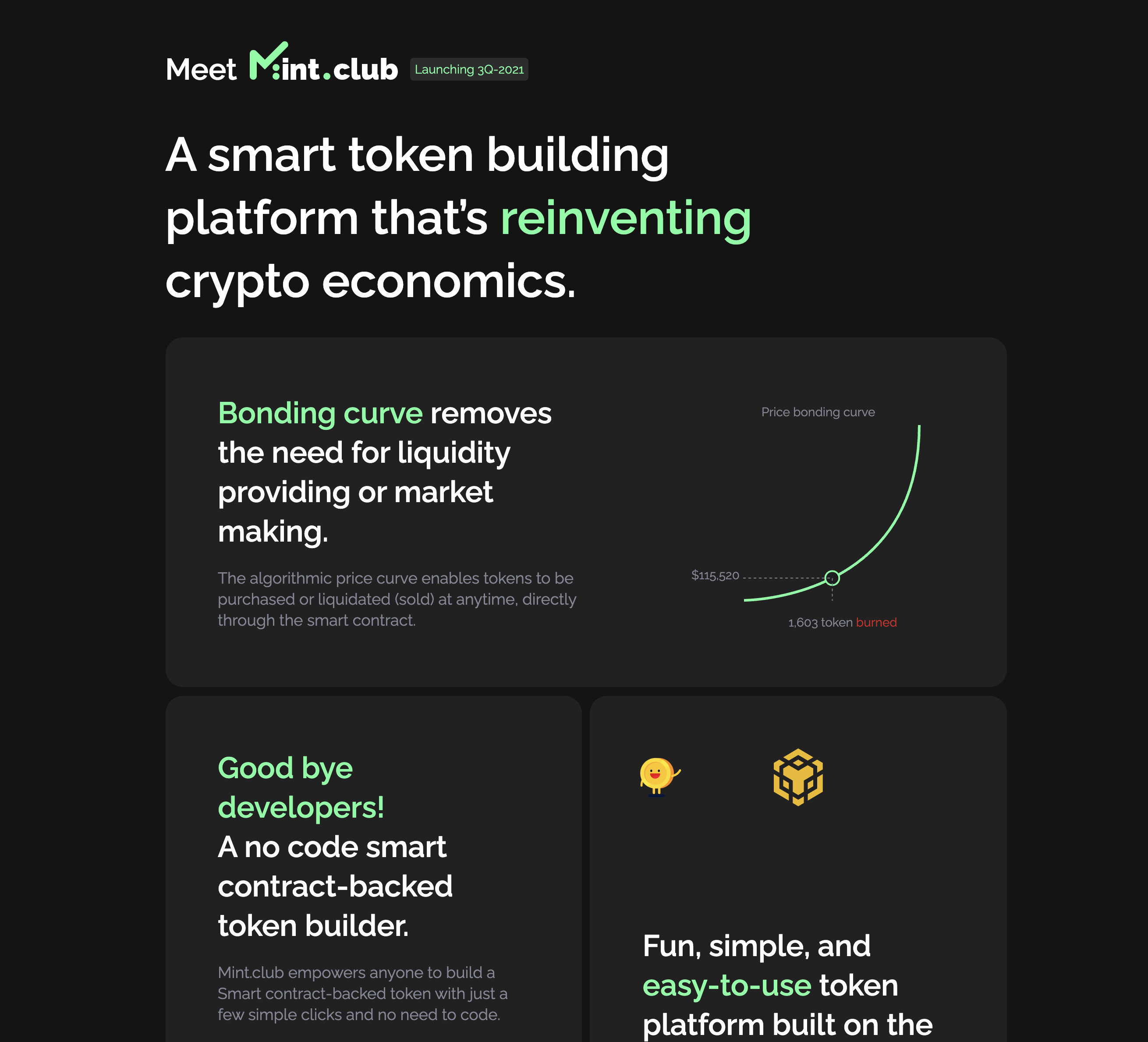 헌트 팀에서는 민트 클럽 (https://mint.club/)이라는 신규 프로젝트를 준비중에 있습니다. 민트 클럽은 누구나 스마트 토큰 (Smart Token)을 만들고 운영할 수 있는 전혀 새로운 방식의 토큰 이코노미 빌딩 플랫폼 입니다.