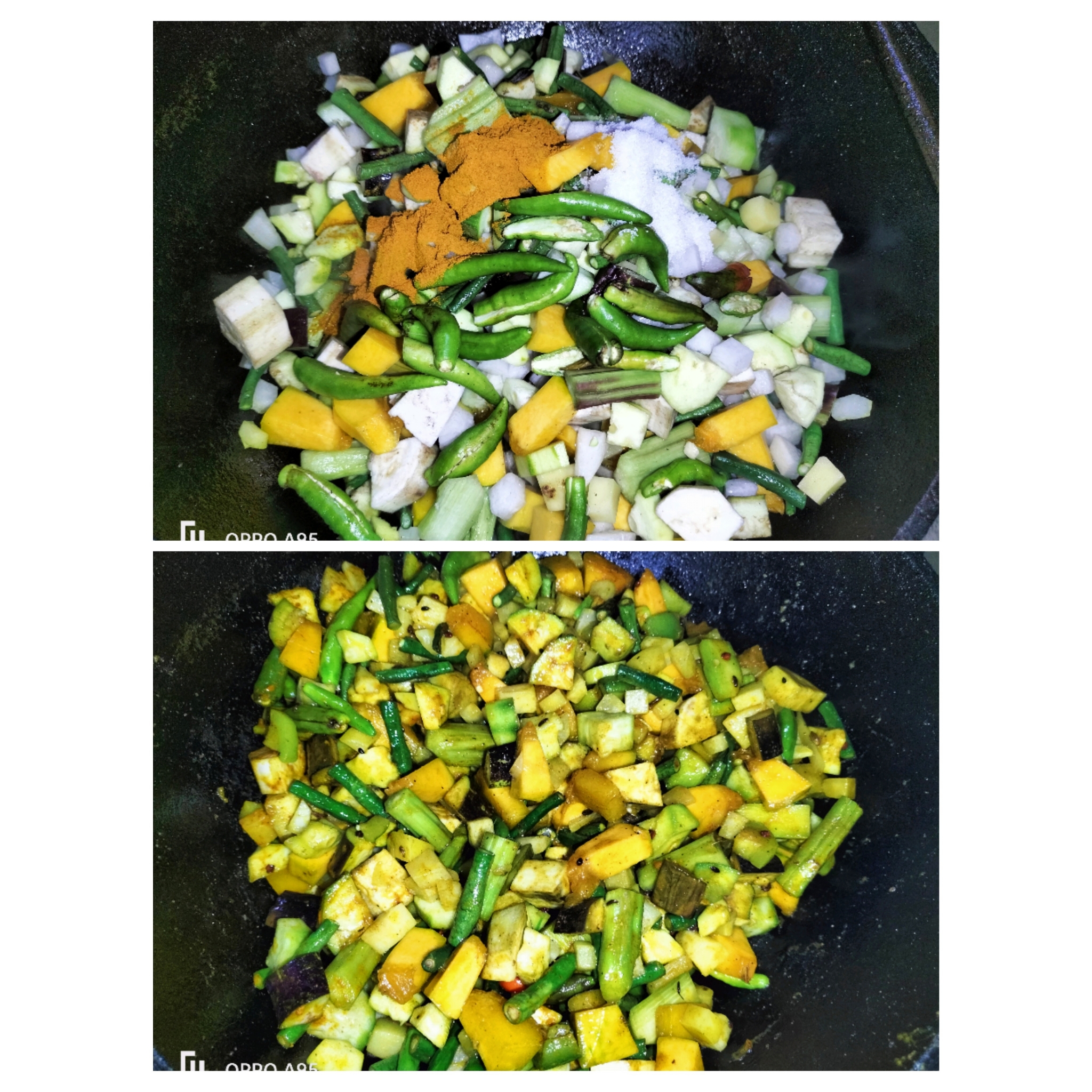 এখন কড়ায়ে দেয়া সবজি গুলোতে লবন,হলুদ,কাঁচা মরিচ দিয়ে খুব ভালো করে নারাচারা করে নিয়েছি।