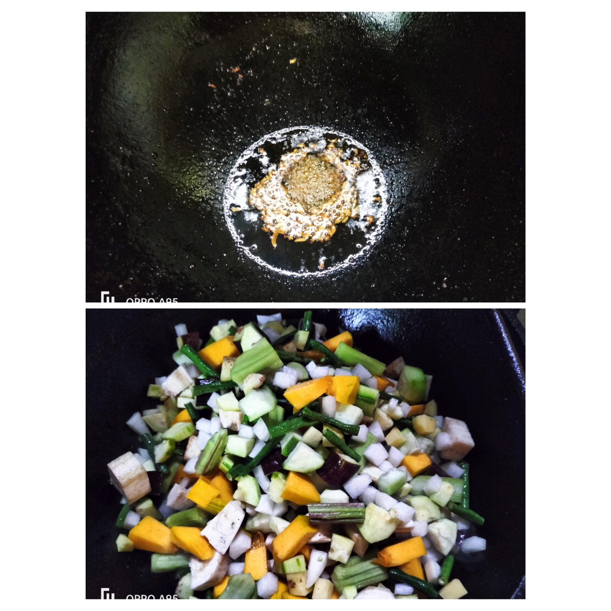 এখন চুলায় কড়াই বসিয়েছি ও তেল দিয়ে গরম করে নিয়েছি তাতে পাঁচফোড়ন দিয়েছি ও হালকা ভেজে নিয়েছি। এরপর সবজি গুলো দিয়েছি।