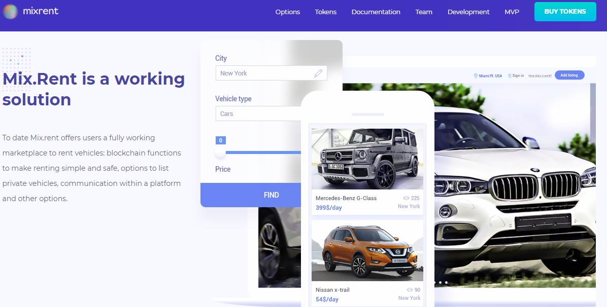 MIXRENT https://mixrent.io/ - это международный рынок, основанный на блокбастере, на аренду и обмен автомобилями. Платформа работает с 2017 года. В настоящее время услуга доступна в США, России, Канаде, Мексике и готовится к запуску в Австралии. В 2019 году платформа также будет работать в следующих странах: Китае, Бразилии, Индии. Платформа объединяет владельцев различных транспортных средств и арендаторов, что позволяет людям арендовать и арендовать автомобили у владельцев по выгодным ценам. В проекте было собрано более 7000 единиц транспортных средств с ежедневными оговорками в разных городах.