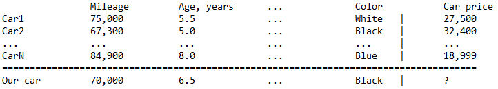 People interested in that car's price can fill out that table. Then we train the ML on the top part of it and ask it to predict the value for the bottom line. Which would be (after some reasonable assumptions) the best price estimate of that car, given the available data.