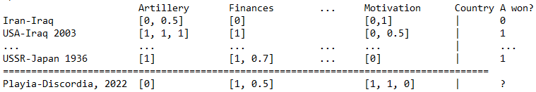 This means we allow more than one figure per cell, and we actually want this. It would look as follows (for the case of predicting war outcome, and the question of "does country A has more than country B of something?"):