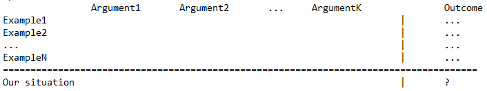 Suppose we need to predict an outcome of some situation. The relevant examples and arguments could be arranged into an ML train/test table like this: