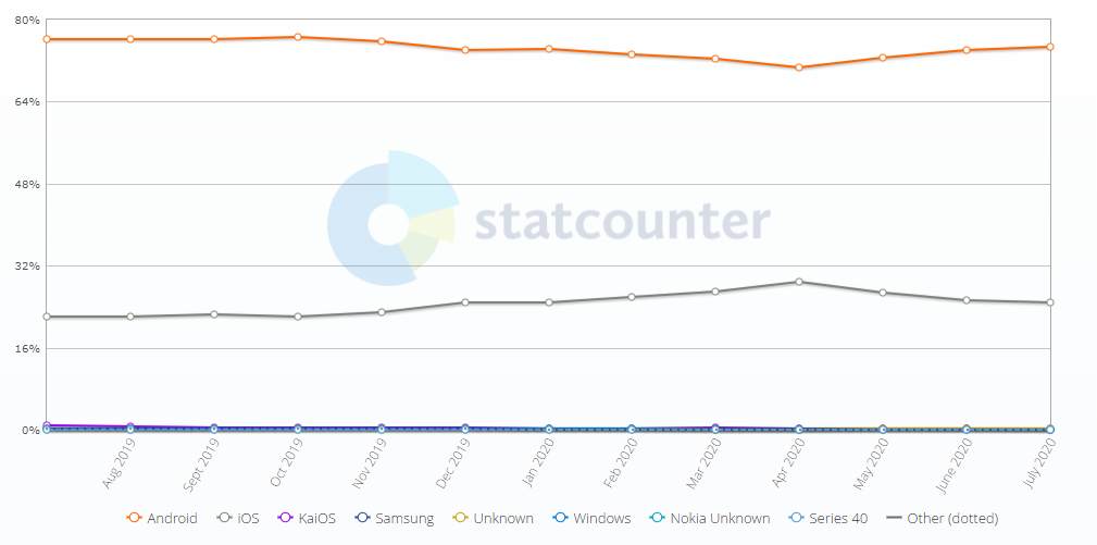 Nowadays most devices run on iOS or Android while the latter is a dominating mobile operating system on the market. As of 2020, Android controls 74.25% of the mobile OS market worldwide whereas 25.15% is left for iOS.
