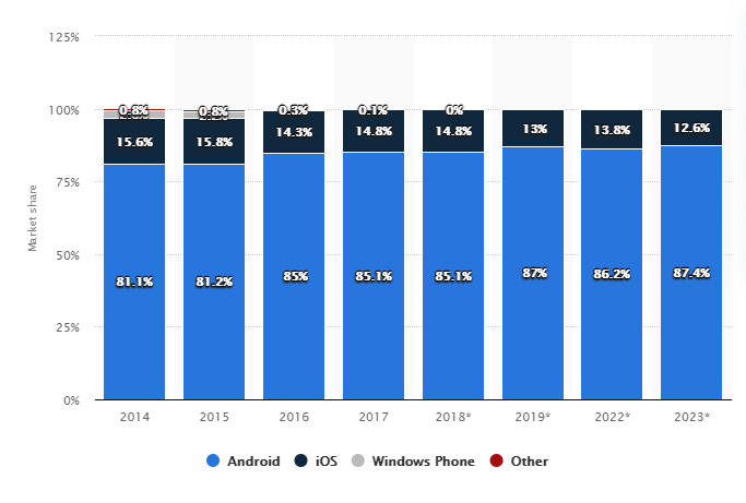 According to another statistic, Android OS is supposed to hit 87.4% and iOS is to target 12.6% of global smartphone shipments by 2023 with other OS making up the minor part.