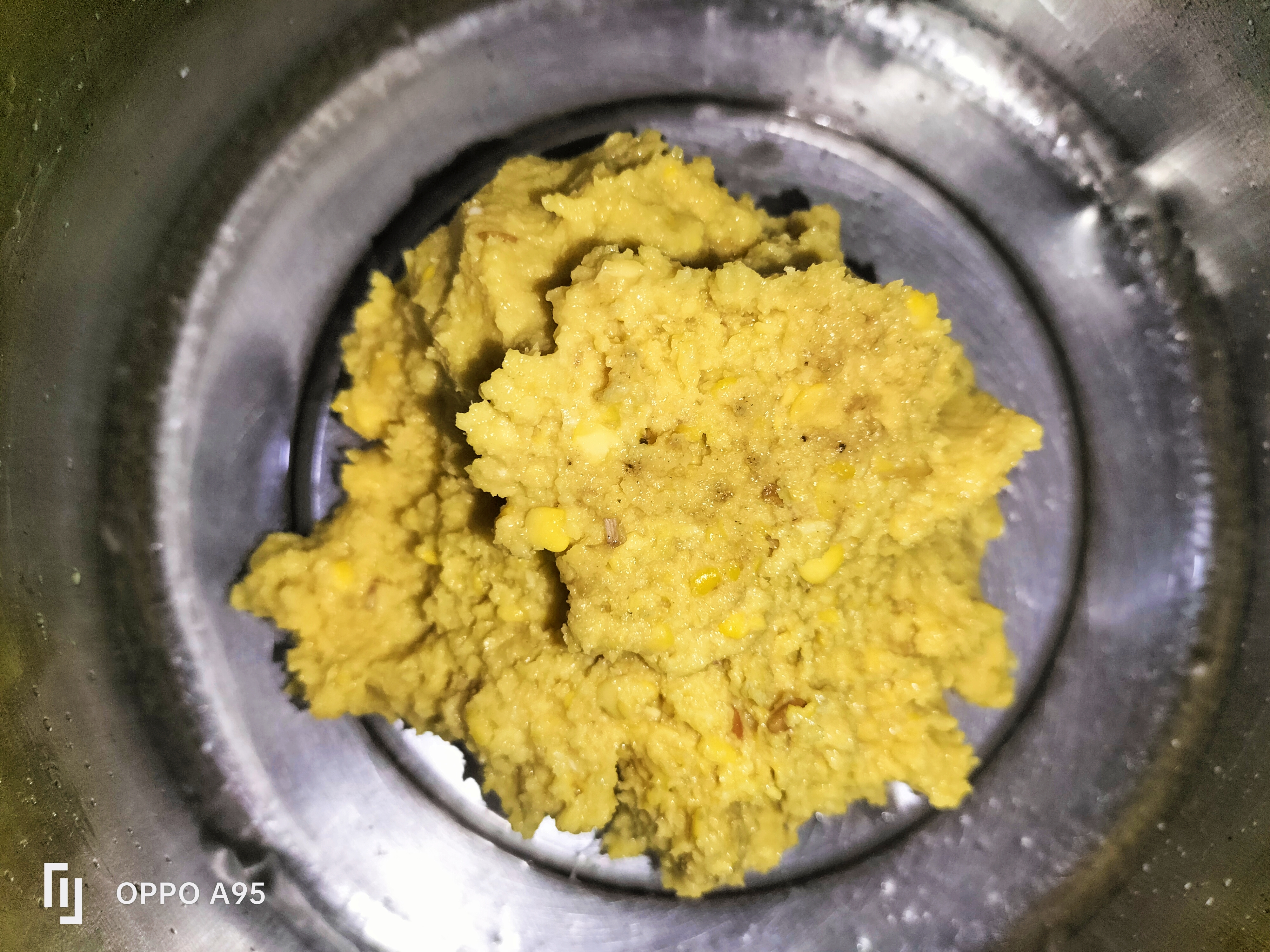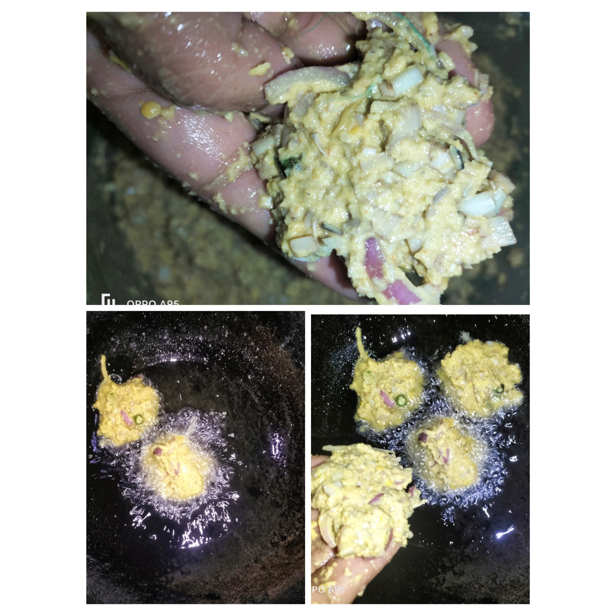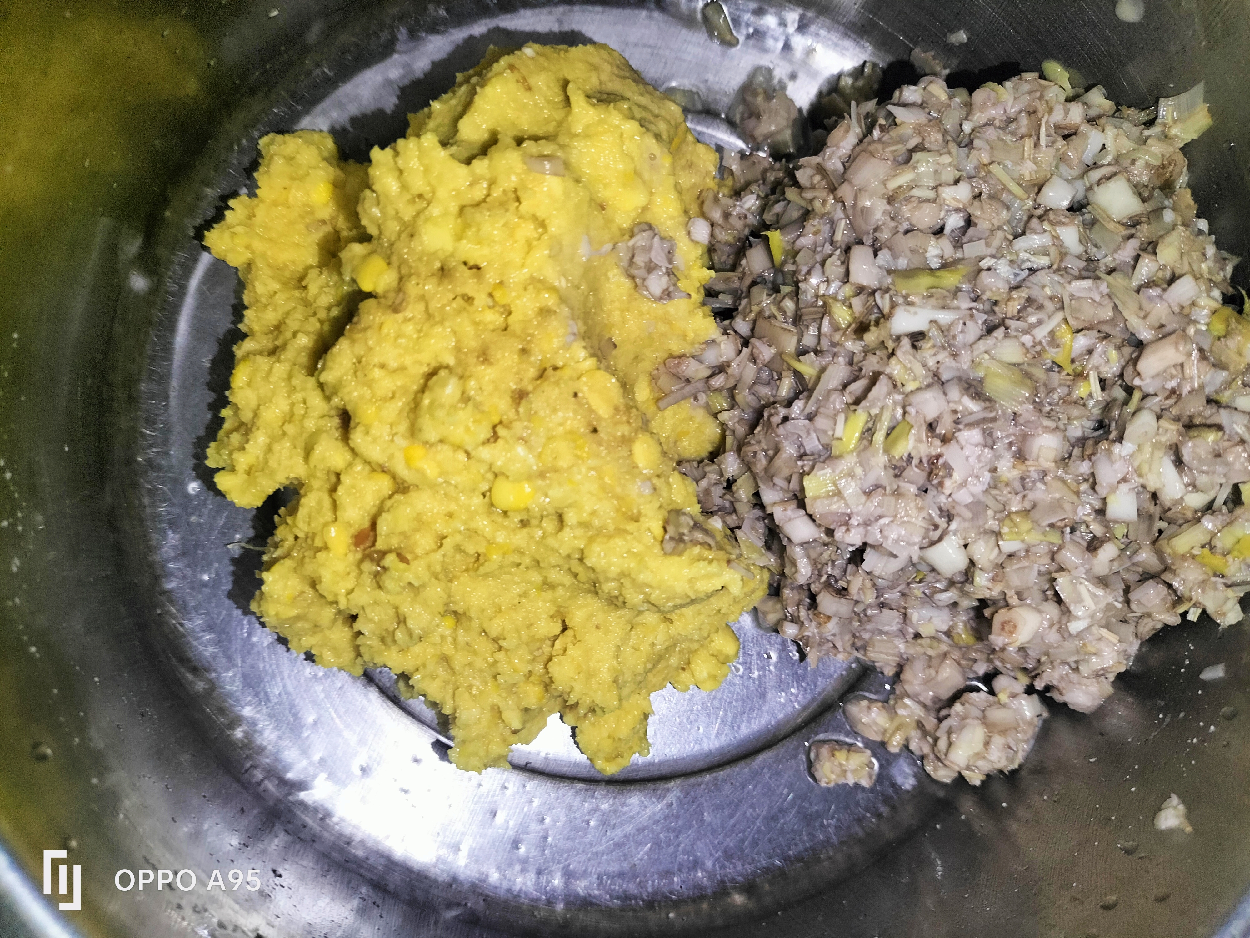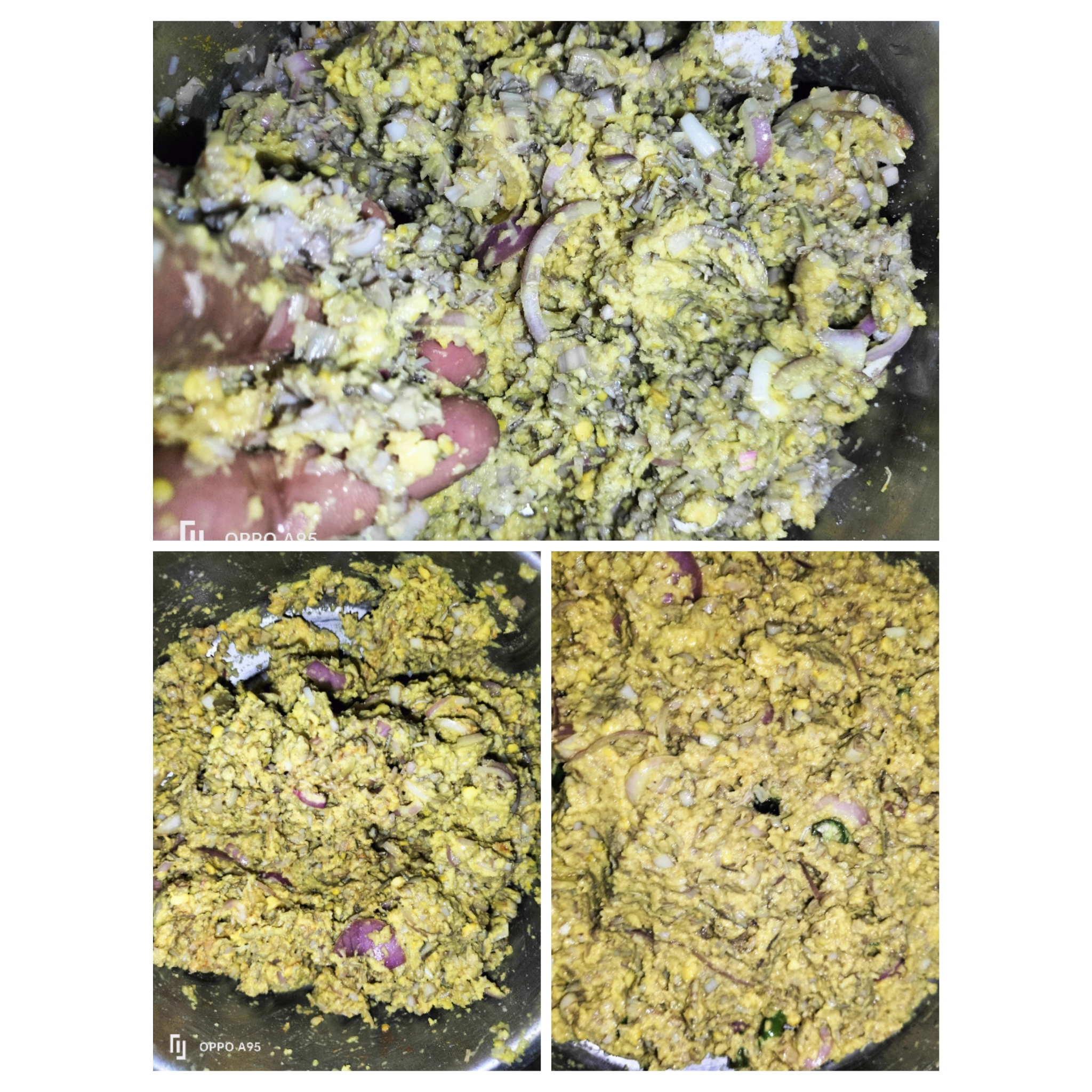 সিদ্ধ করা কলার মোচা গুলো চিপে চিপে বাটা খেঁসারির ডালে দিয়েছি।