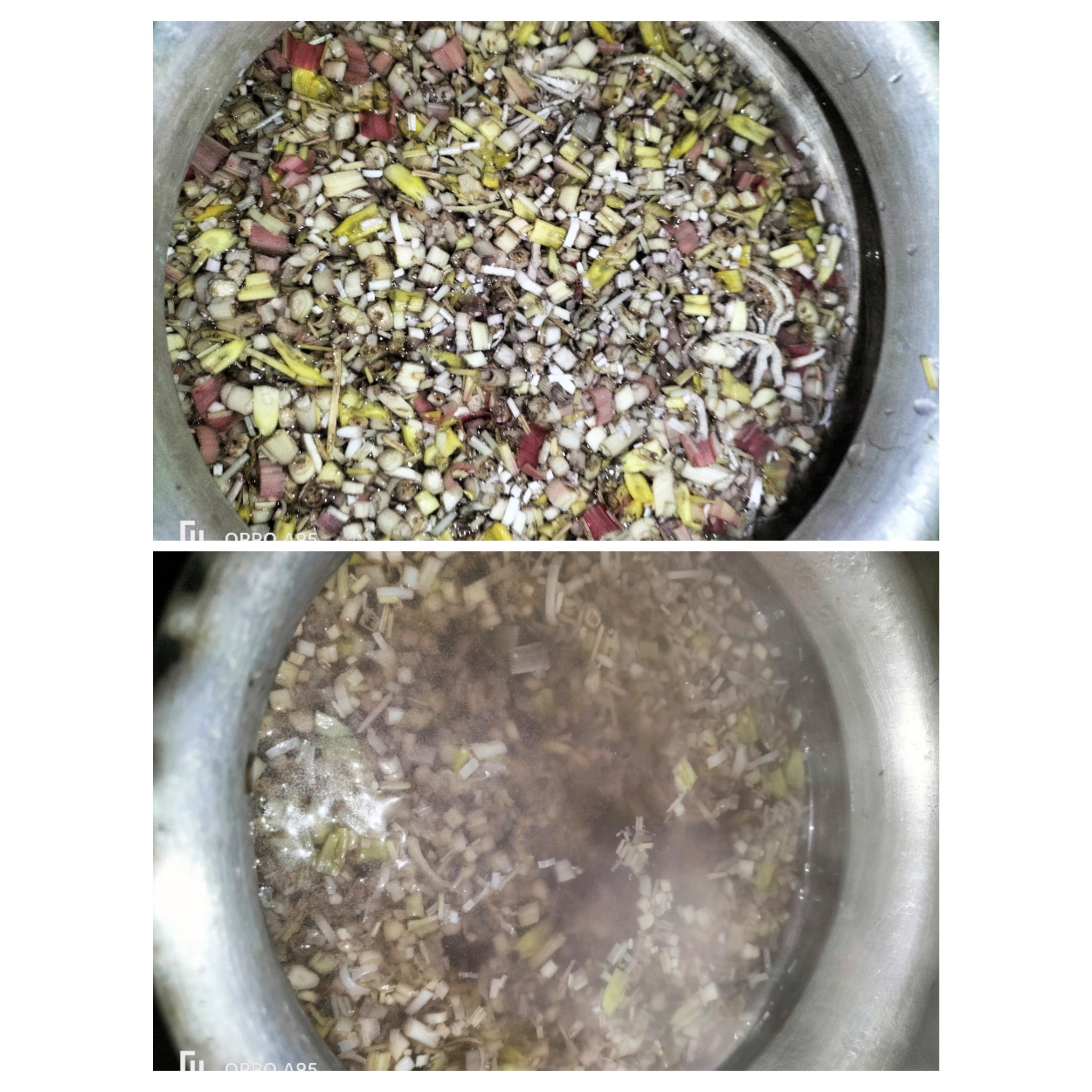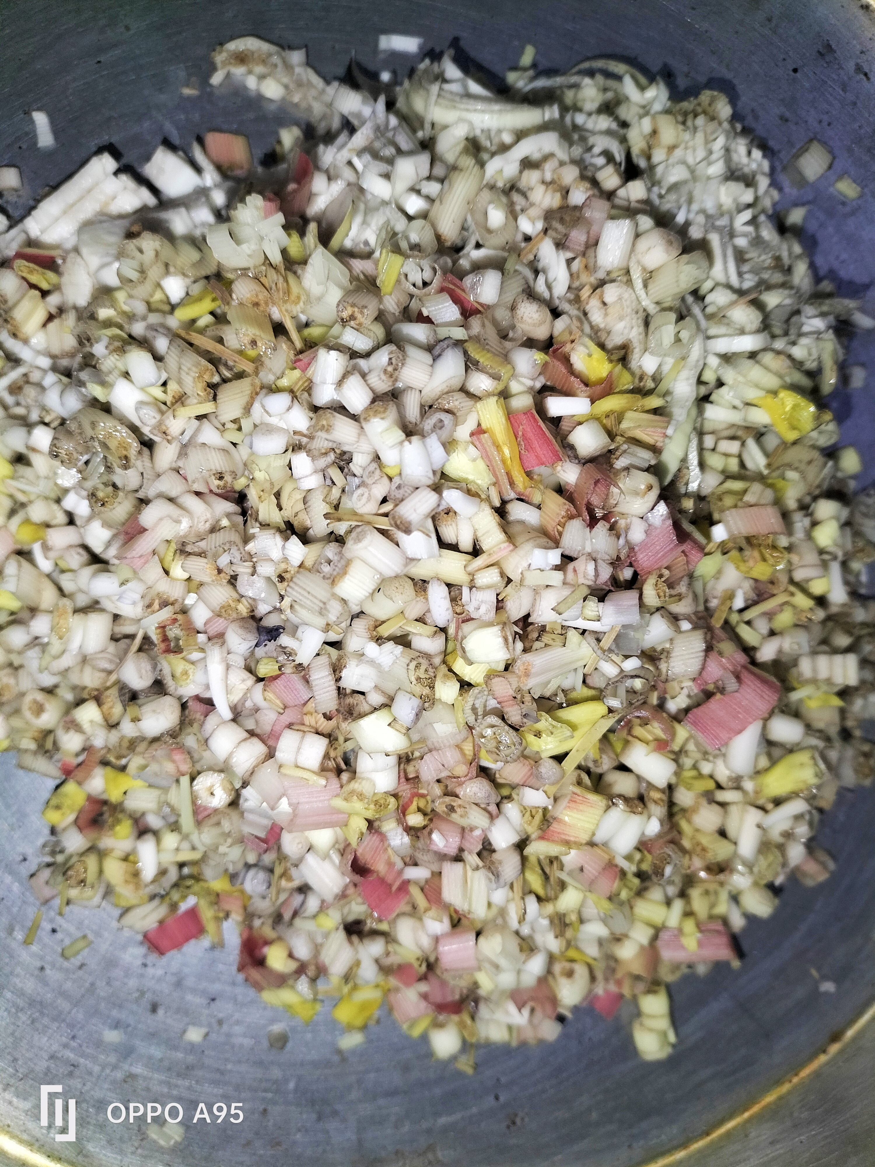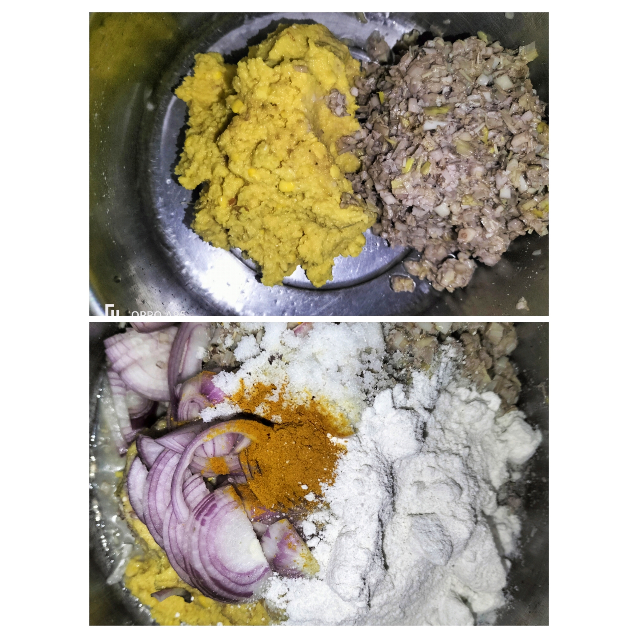 এখন কলার মোচা ও খেঁসারির ডালে পেঁয়াজ কুচি, কাঁচামাল কুঁচি, লবন,হলুদ, মরিচের গুড়া দিয়েছি।