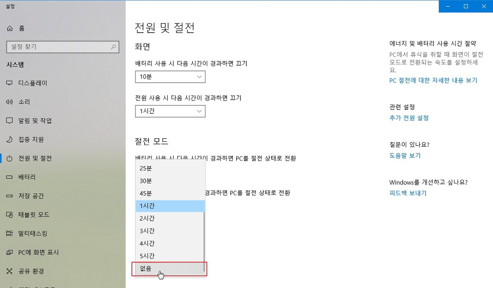 - 전원 및 절전 화면에서 '절전 모드' 에서 시간이 설정되어 있다면 '없음' 으로 변경합니다.