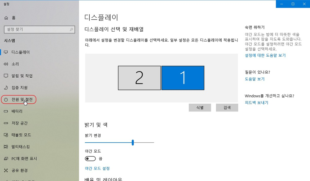 - 디스플레이 설정 화면 좌측 메뉴에서 '전원 및 절전' 메뉴를 선택합니다.