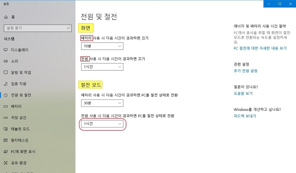 전원 및 절전 화면에서 절전 모드 해제 시키기