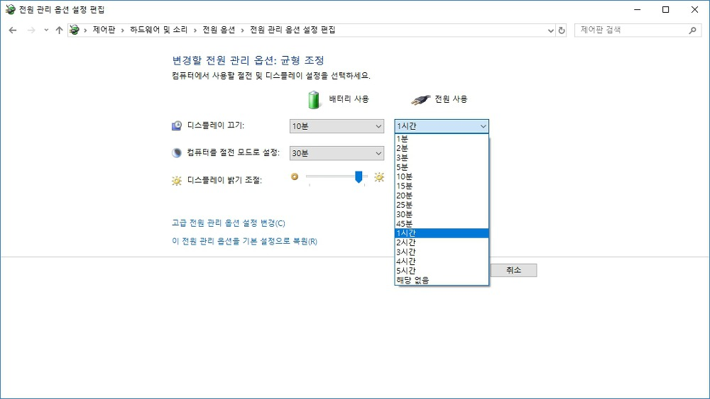 노트북을 사용중이기 때문에 배터리 사용, 전원 사용 두가지 항목이 보입니다. (PC에서 설정할 경우 다르게 보일 수 있음)