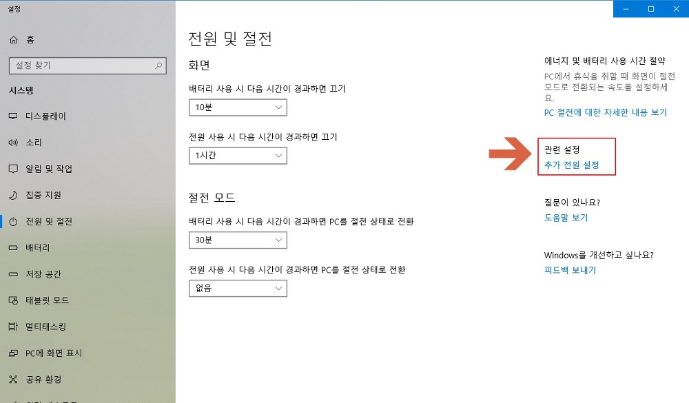 아래 화면에서와 같이 '전원 및 절전' 화면의 오른쪽에 빨간네모 박스에 있는 '추가 전원 설정'을 누릅니다.