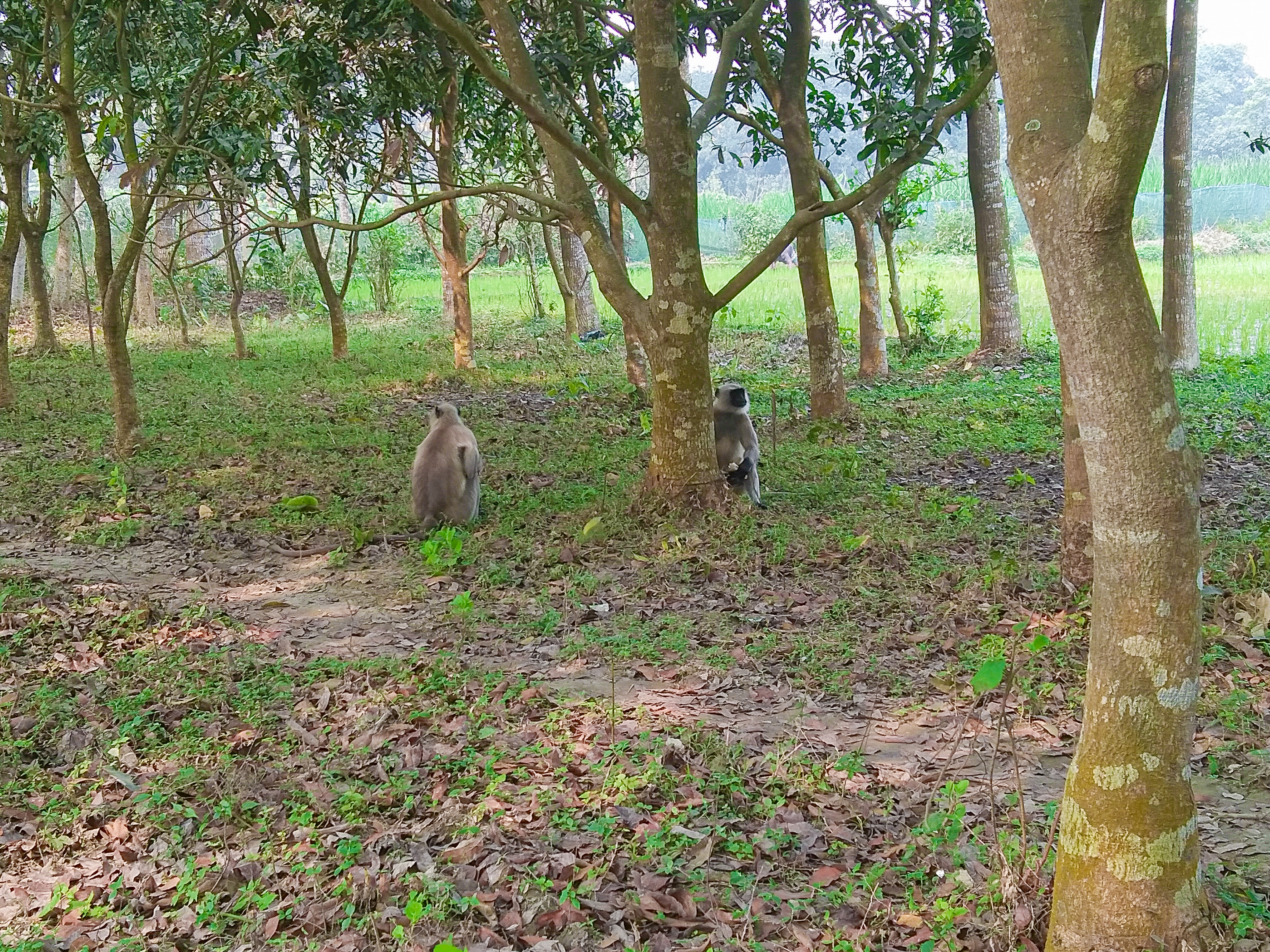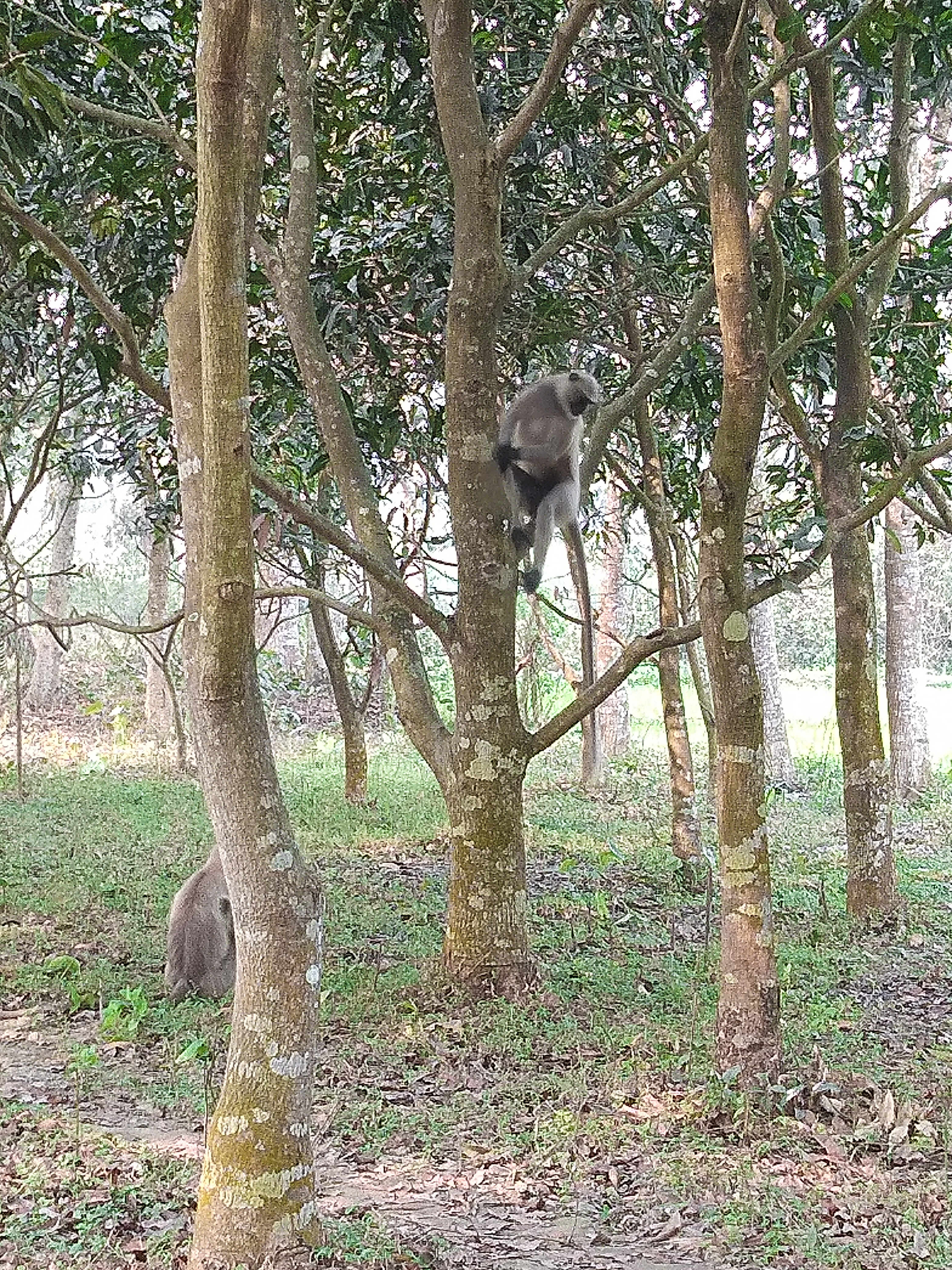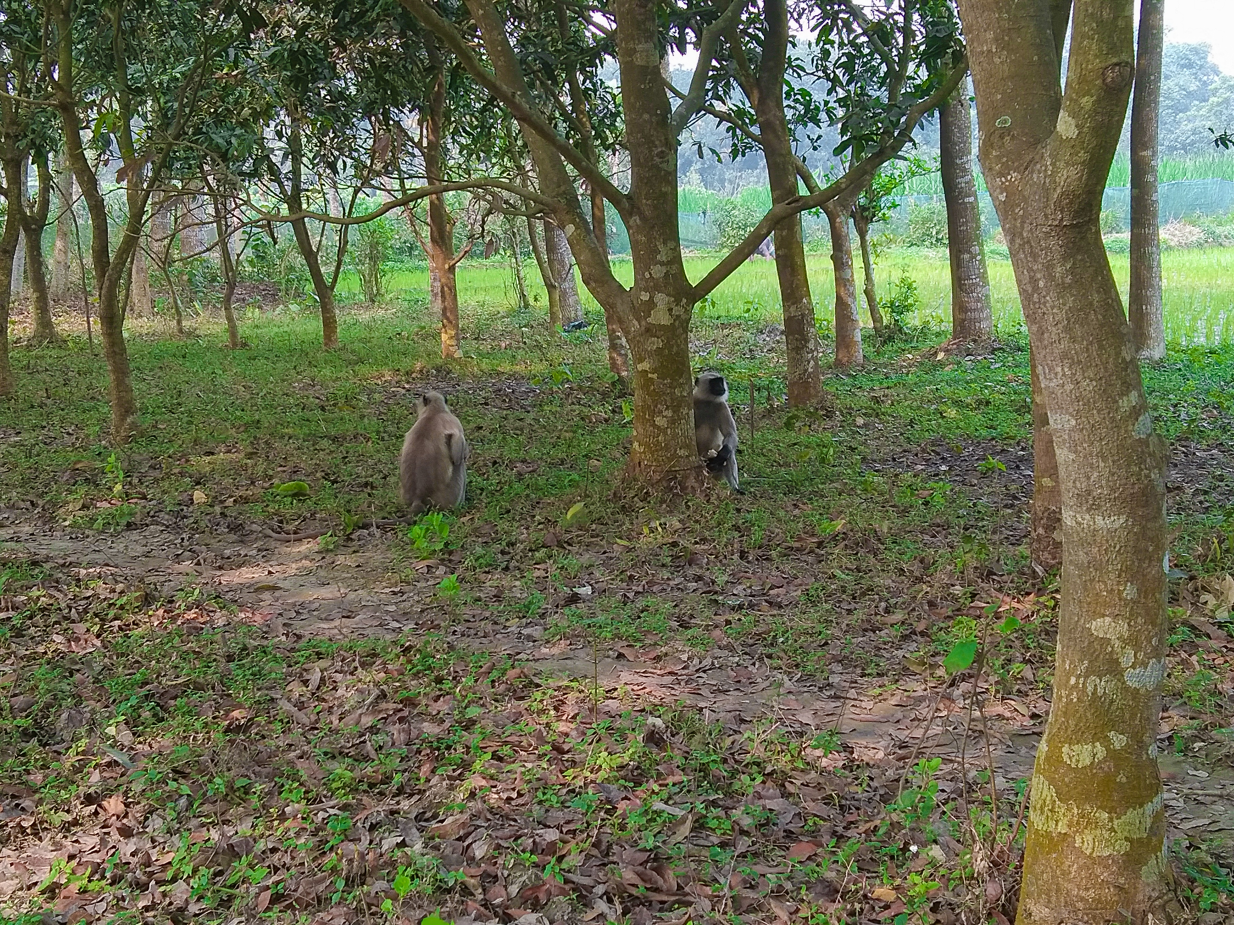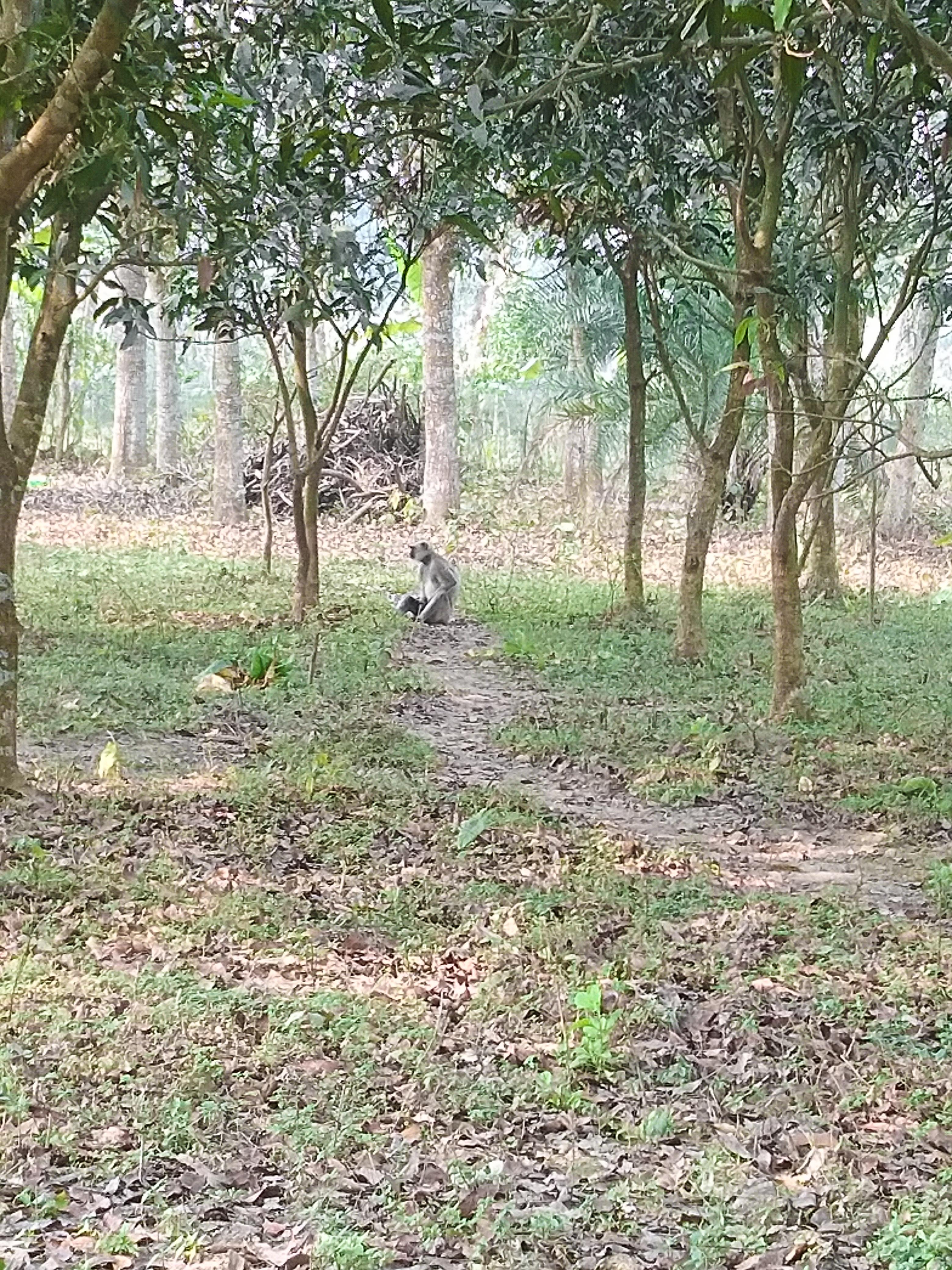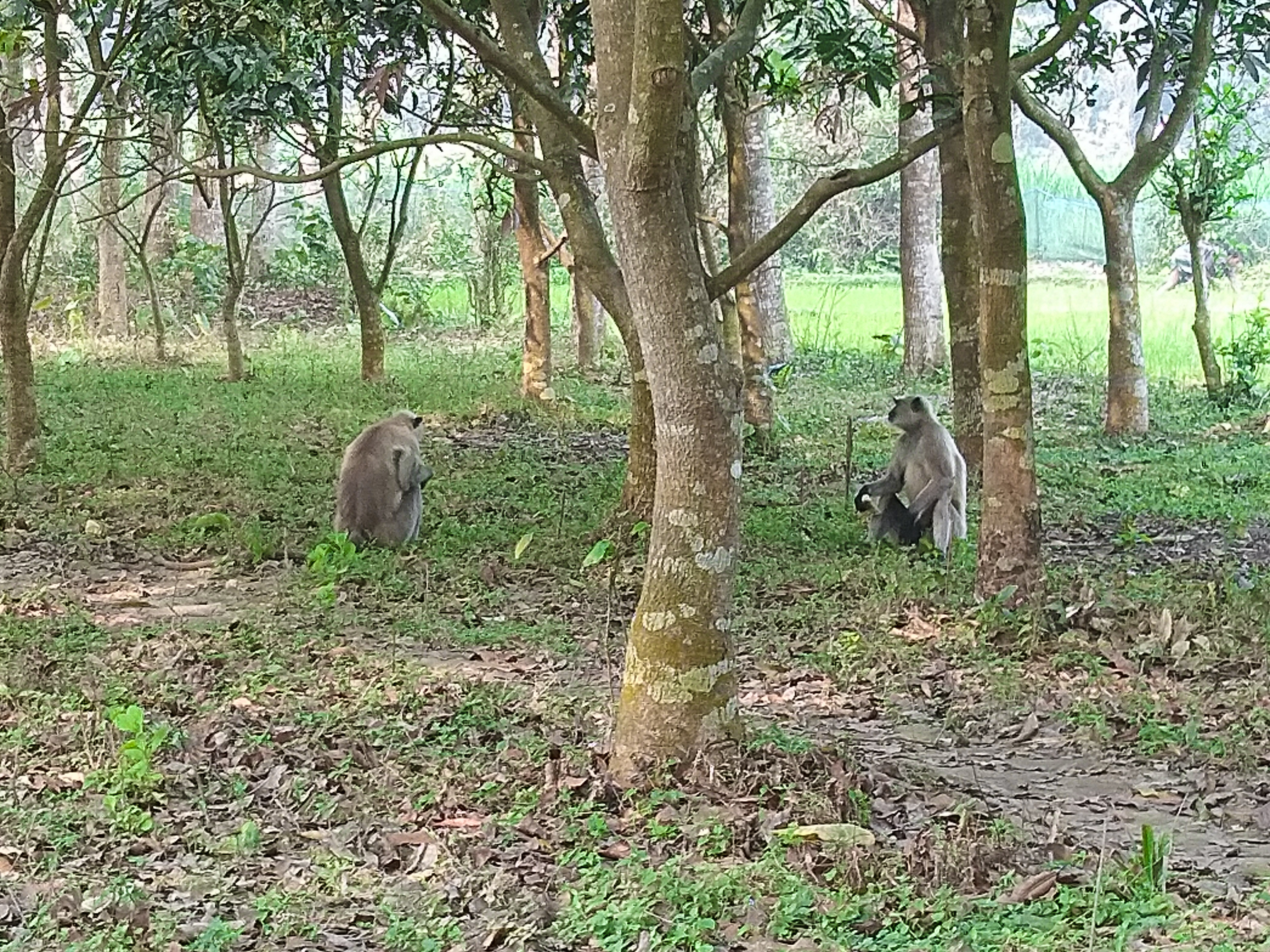 যাইহোক তারপর দেখলাম হনুমান গুলো দৌড়াতে দৌড়াতে একটা আম বাগানের মধ্যে চলে গেল। এবং দেখি দুইটা অনুমান আম গাছের উপর বসে আছে এবং আর একটা হনুমান দূরে বসে আছে। তখন আমি দূর থেকে জুম করে হনুমান গুলোর কয়েকটা ছবি তুলে নিয়েছিলাম। যাইহোক তখন আমাদের পাশের বাড়ির একটা ছেলে সাজ্জাদ ও বলছে যায় বাড়ি থেকে কয়েকটা রুটি নিয়ে আসি হনুমানকে খাওয়াবো। তো দেখলাম ও দৌড়াতে দৌড়াতে গিয়ে বাড়ি থেকে তিনটা হনুমানের জন্য তিনটা রুটি নিয়ে চলে এসেছে।