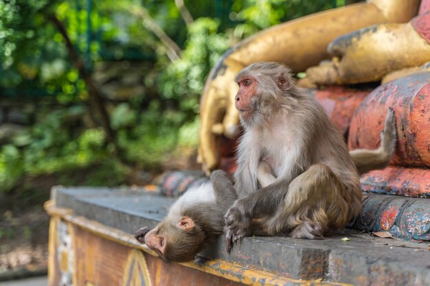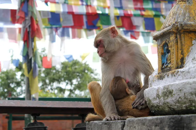 The resident monkeys, known as rhesus macaques, are a distinctive feature of the temple complex. They roam freely around the area, often interacting with visitors, although caution is advised as they can be mischievous.