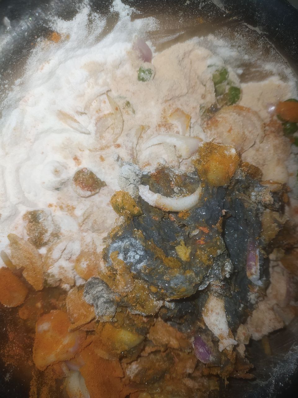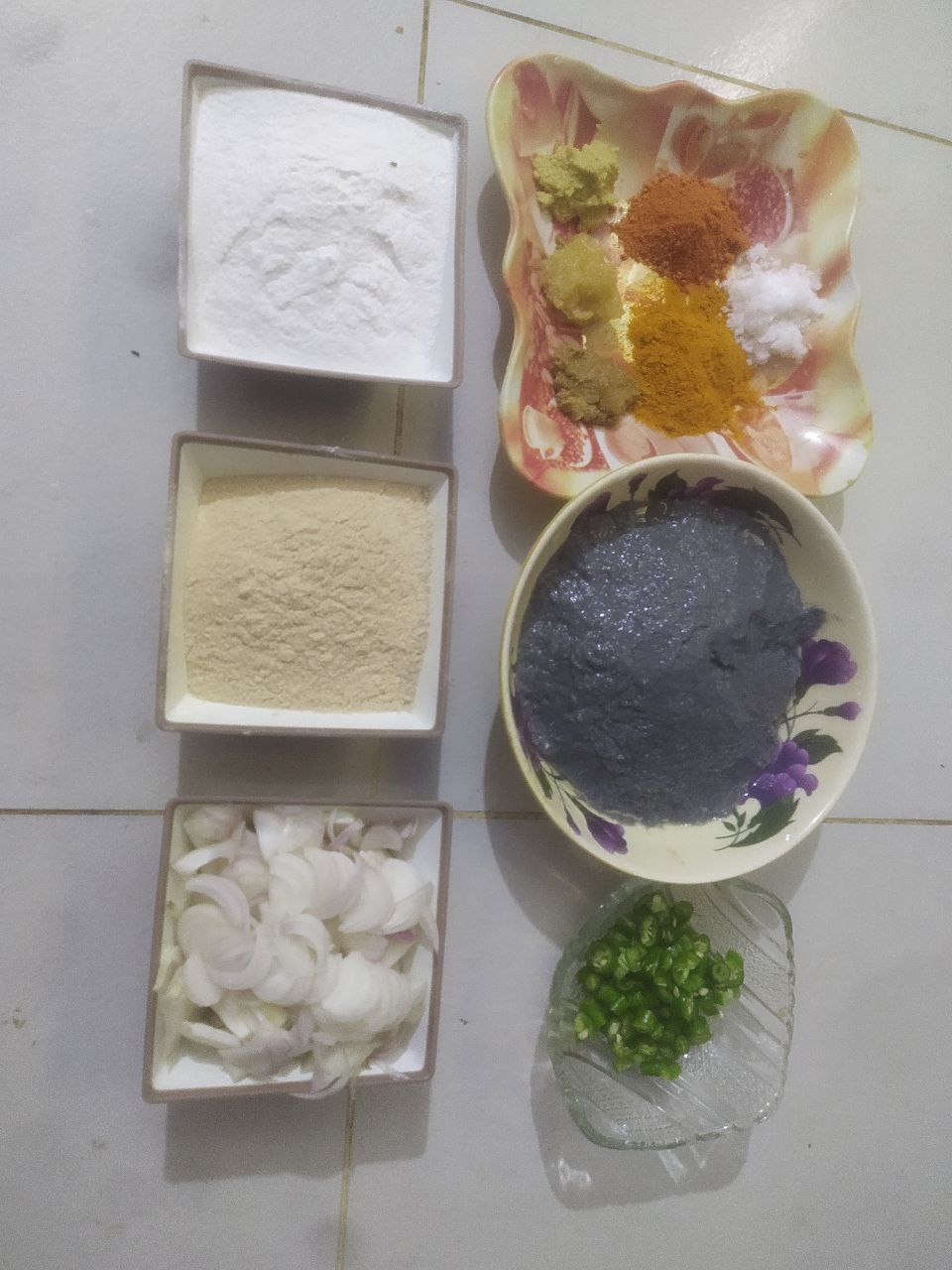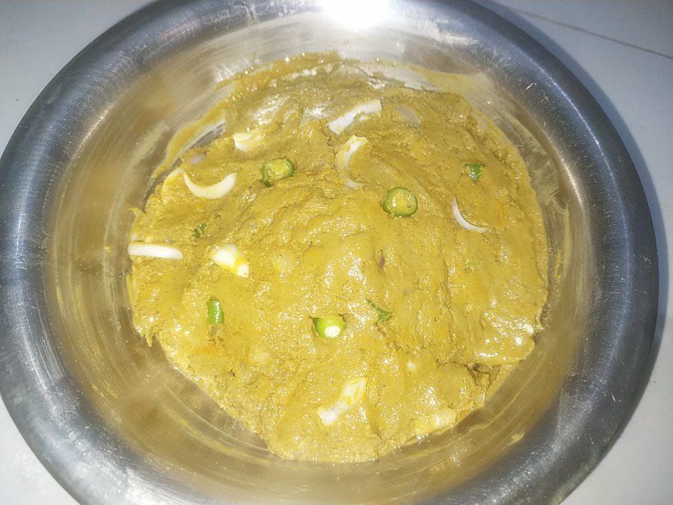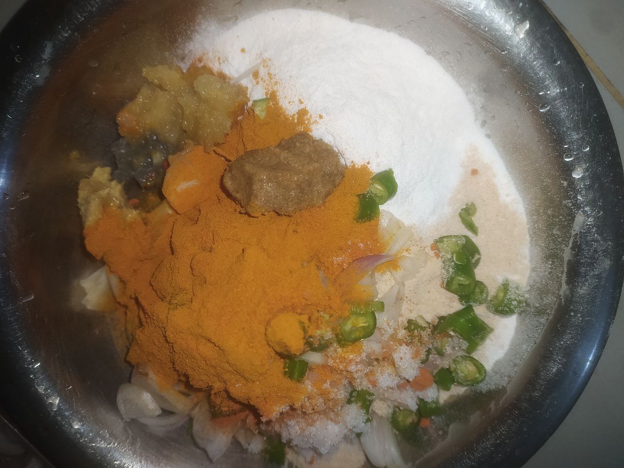 মাছগুলো বাটার পরে আমি একটি বাটিতে চাউলের গুঁড়ি, বেসন, চান্দা মাছের বাটা, পেঁয়াজ কুচি, কাঁচা মরিচ কুচি, আদা বাটা, রসুন বাটা, জিরা বাটা, মরিচের গুড়ো, হলুদের গুড়ো,লবণ পরিমাণ দিয়ে দিলাম।