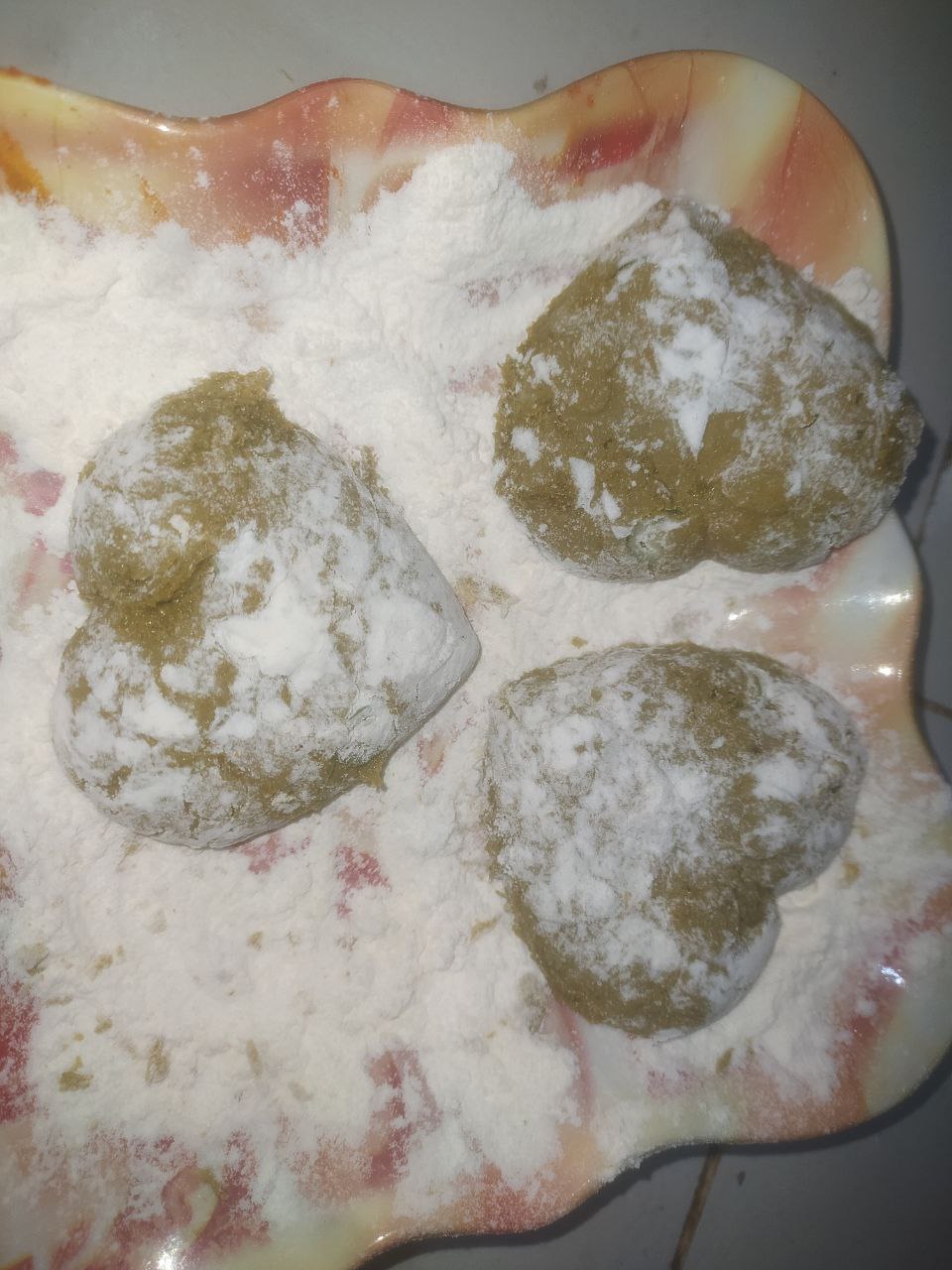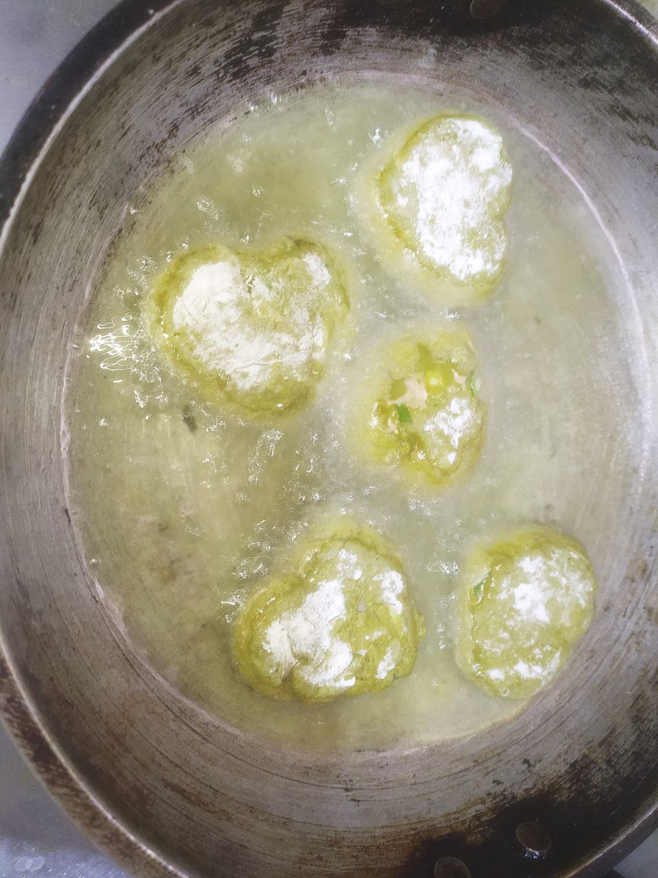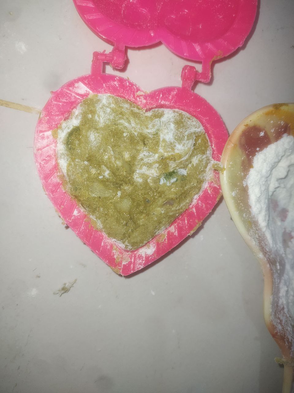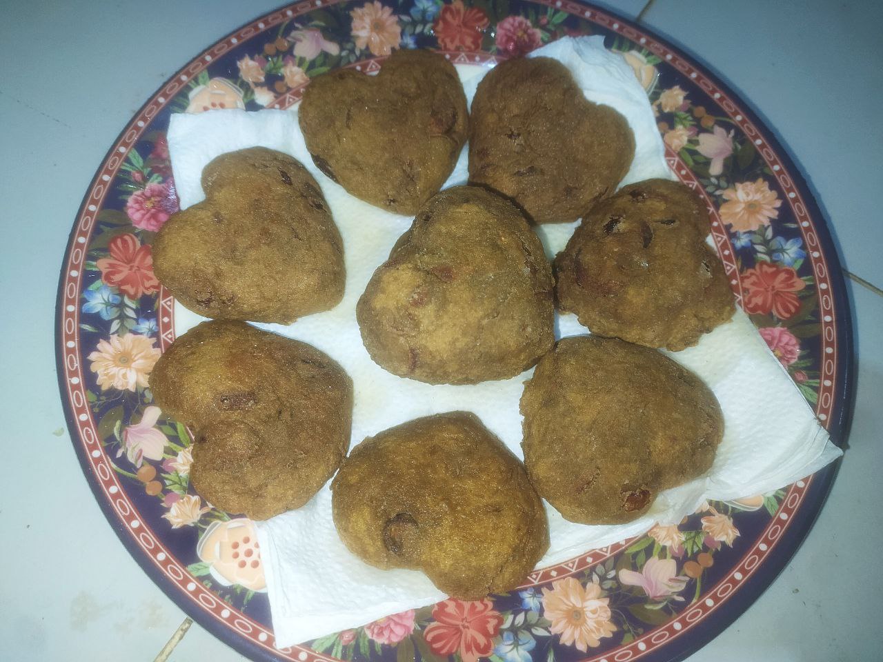 তারপরে আমি একটি প্লাস্টিকের লাভ আকৃতির পিঠা বানানোর ছাপ নিলাম। তারপর সেটাতে আমার তৈরি করা মিশ্রণগুলো অল্প অল্প দিয়ে আমি লাভা আকৃতির মাছের বড়া বানিয়ে নিলাম। বড়া গুলো ময়দার মধ্যে রাখলাম যেন ভেঙ্গে না যায়।