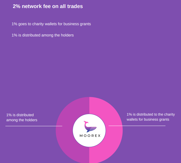 Moorex is a community focused multi-chain token aiming to bring transparency and anonymity into charity in the finance sector. Moorex Token has a maximum supply of 100 billion on the Ethereum blockchain and Binance Smart Chain. A 1% transaction tax is distributed among all holders, which means everyone that holds Moorex Token will receive a never ending cycle of passive income. Another 1% goes to the charity wallet for business grants.