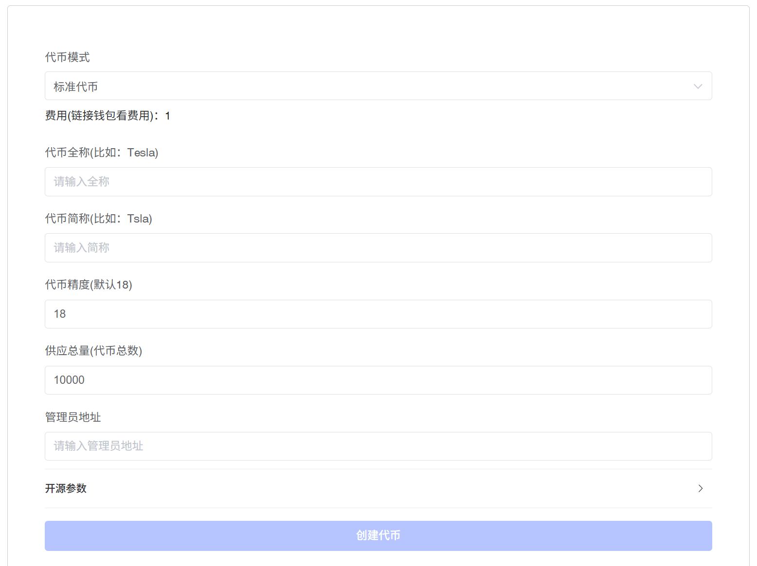 除填写标准代币的基本信息(名称、符号、总供应量等)外,需额外设置: