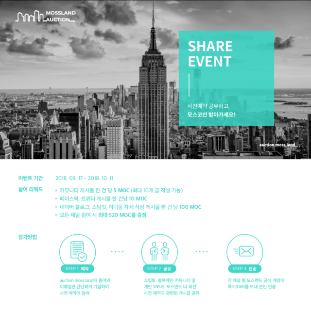 오는 10월 12일, 가상 건물 경매 서비스 ‘모스랜드 더 옥션’ 출시에 앞서 커뮤니티 여러분을 위한 사전 예약 페이지 오픈 기념 공유 이벤트를 공개합니다.