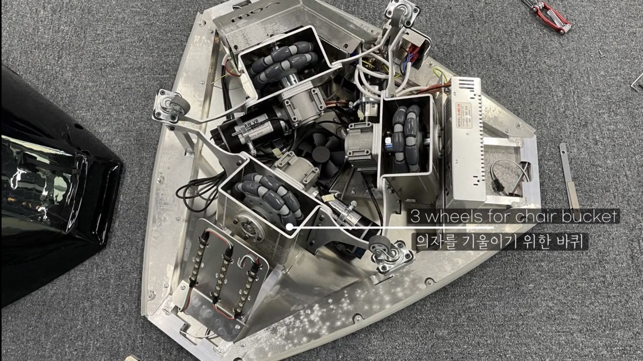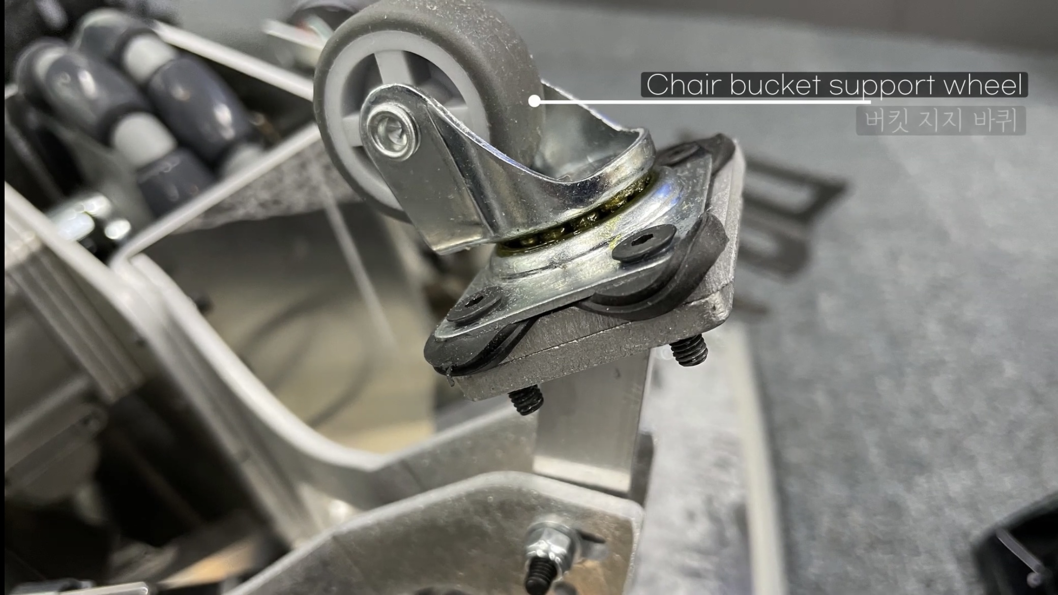 볼트를 풀면 커버를 제거할 수 있는데 둥근 의자를 굴릴 바퀴 3개가 등장합니다.