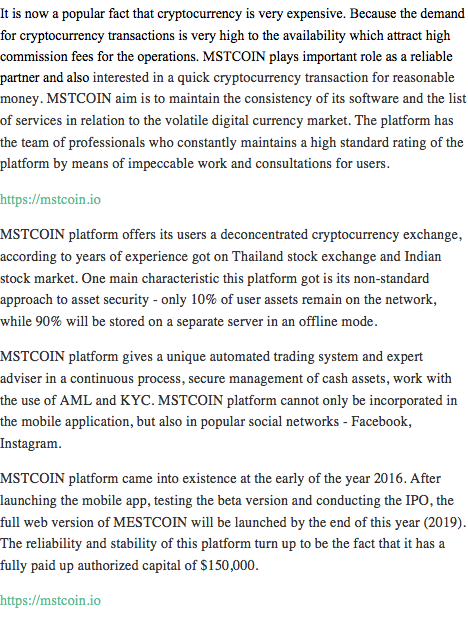 It is now a popular fact that cryptocurrency is very expensive. Because the demand for cryptocurrency transactions is very high to the availability which attract high commission fees for the operations. MSTCOIN plays important role as a reliable partner and also interested in a quick cryptocurrency transaction for reasonable money. MSTCOIN aim is to maintain the consistency of its software and the list of services in relation to the volatile digital currency market. The platform has the team of professionals who constantly maintains a high standard rating of the platform by means of impeccable work and consultations for users.