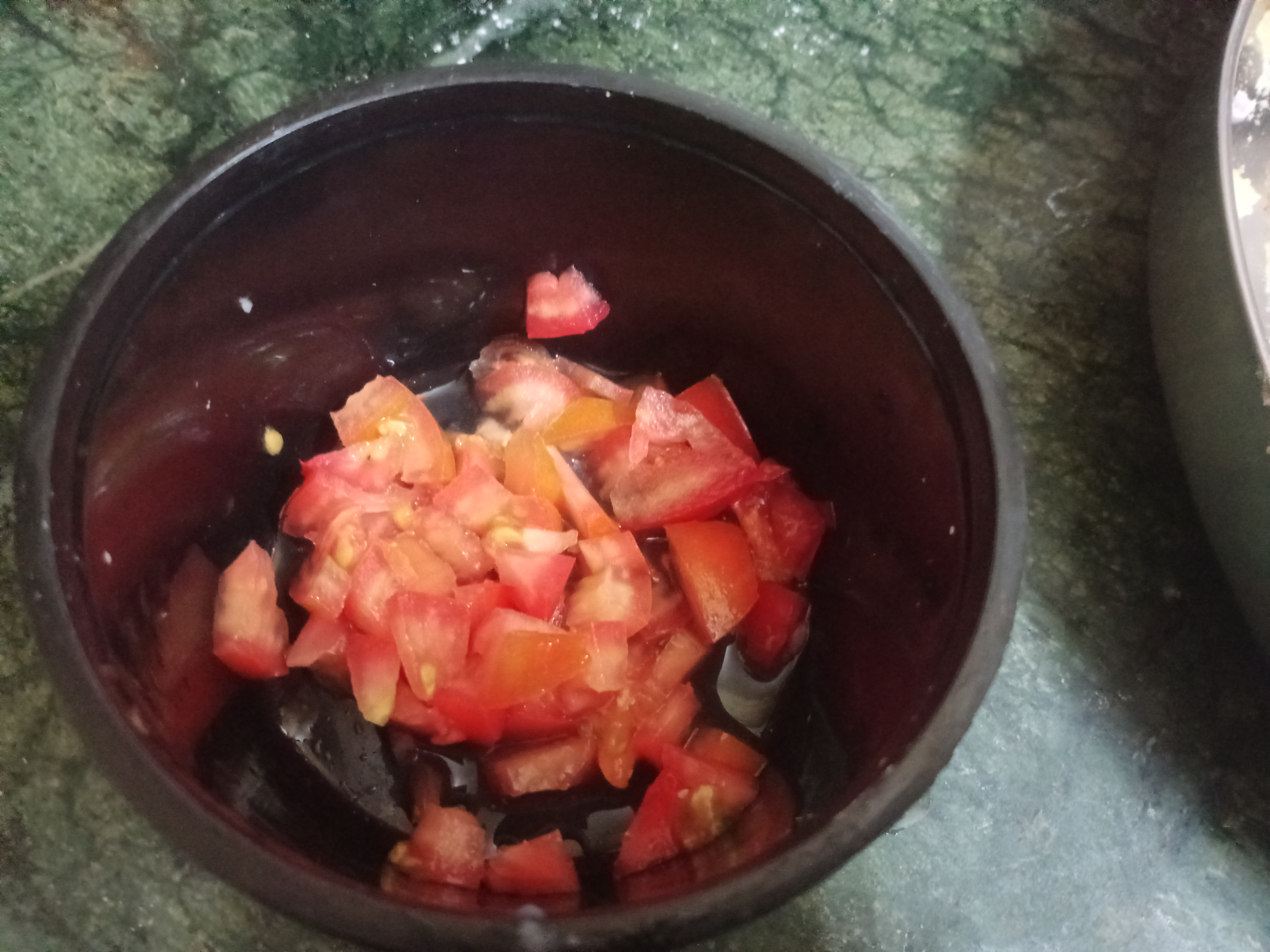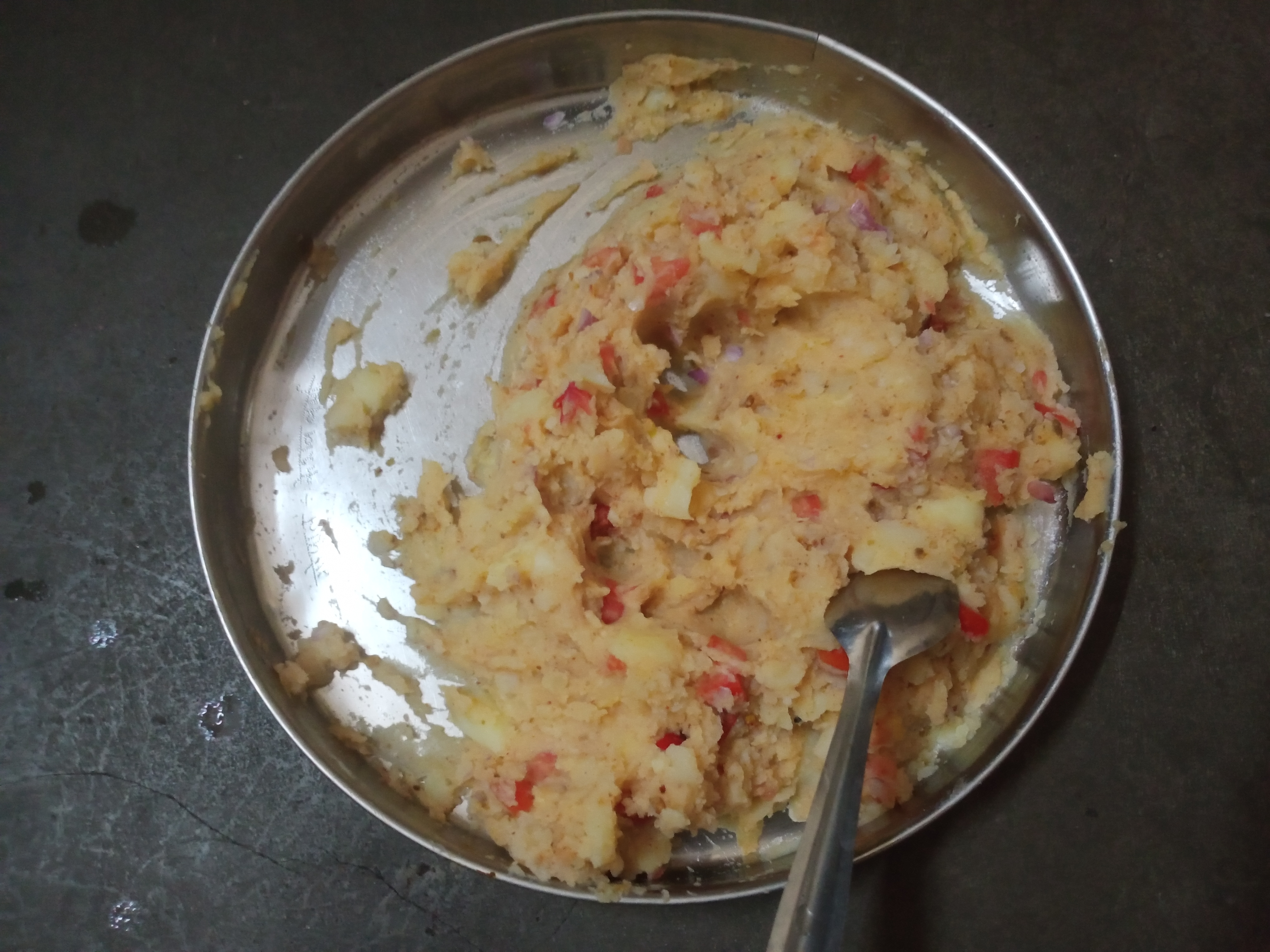 - Boil the potatoes, peel them, and mash them well. Add the chopped coriander leaves, chopped tomatoes, onions, salt, and red chili powder (according to taste), and thoroughly mix in the red chili pickle masala.