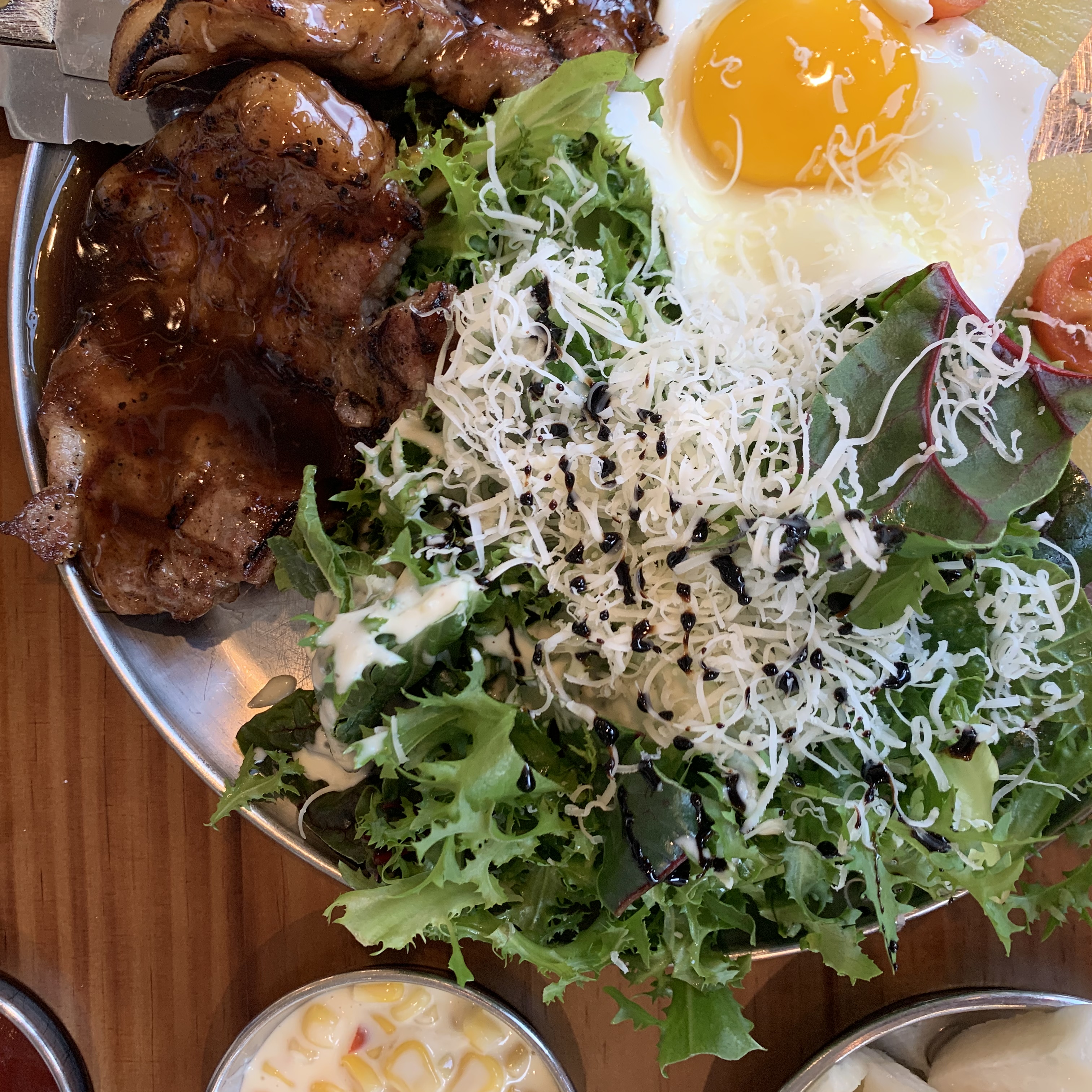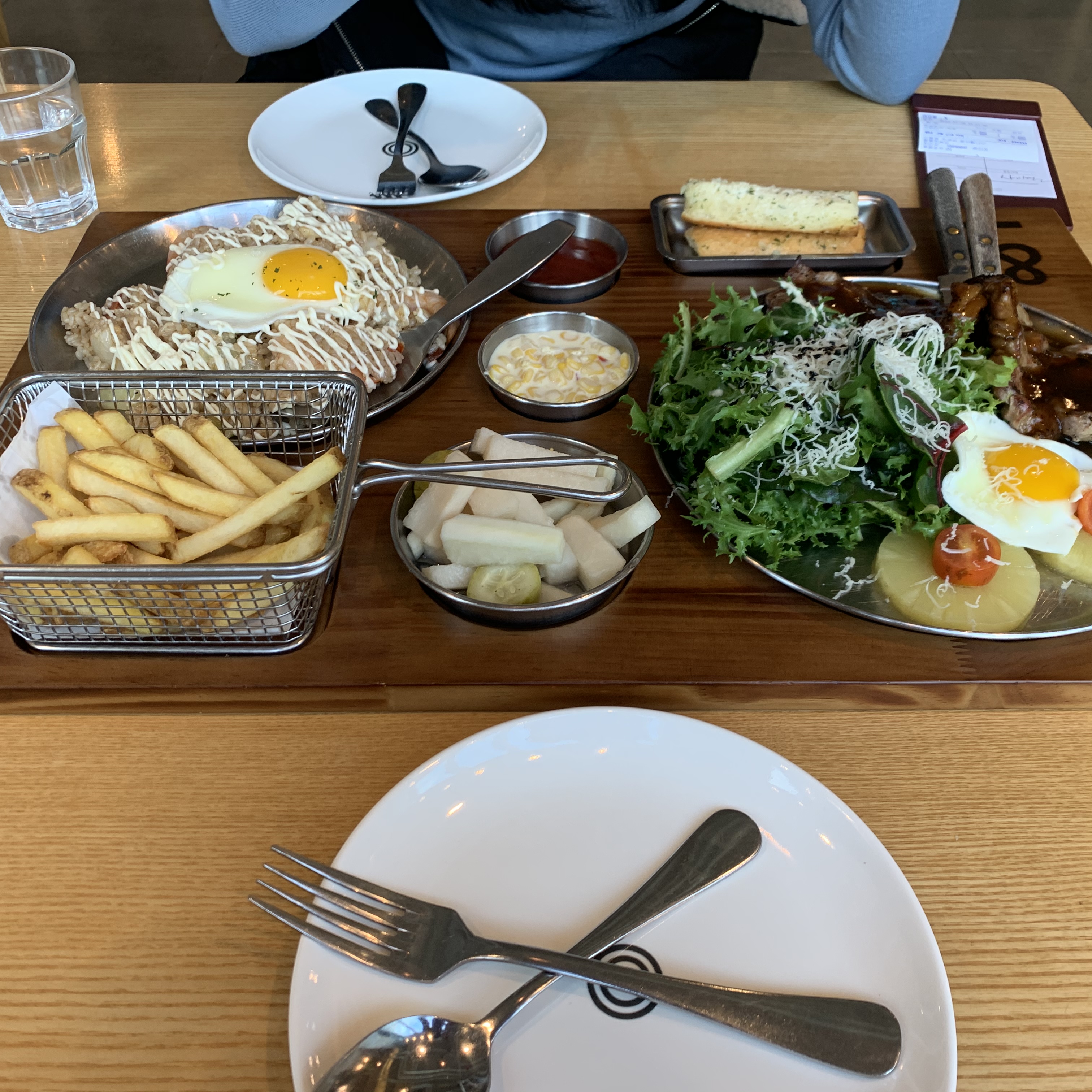 저렇게 한상이 32800원입니다 새우볶음밥은 짜지않고 좋고 목살스테이크는 퀄리티가 떨어지는건 어쩔수없지만 가격대비 저는 충분하다고 봅니다ㅎㅎ 감자튀김도 있습니다!!