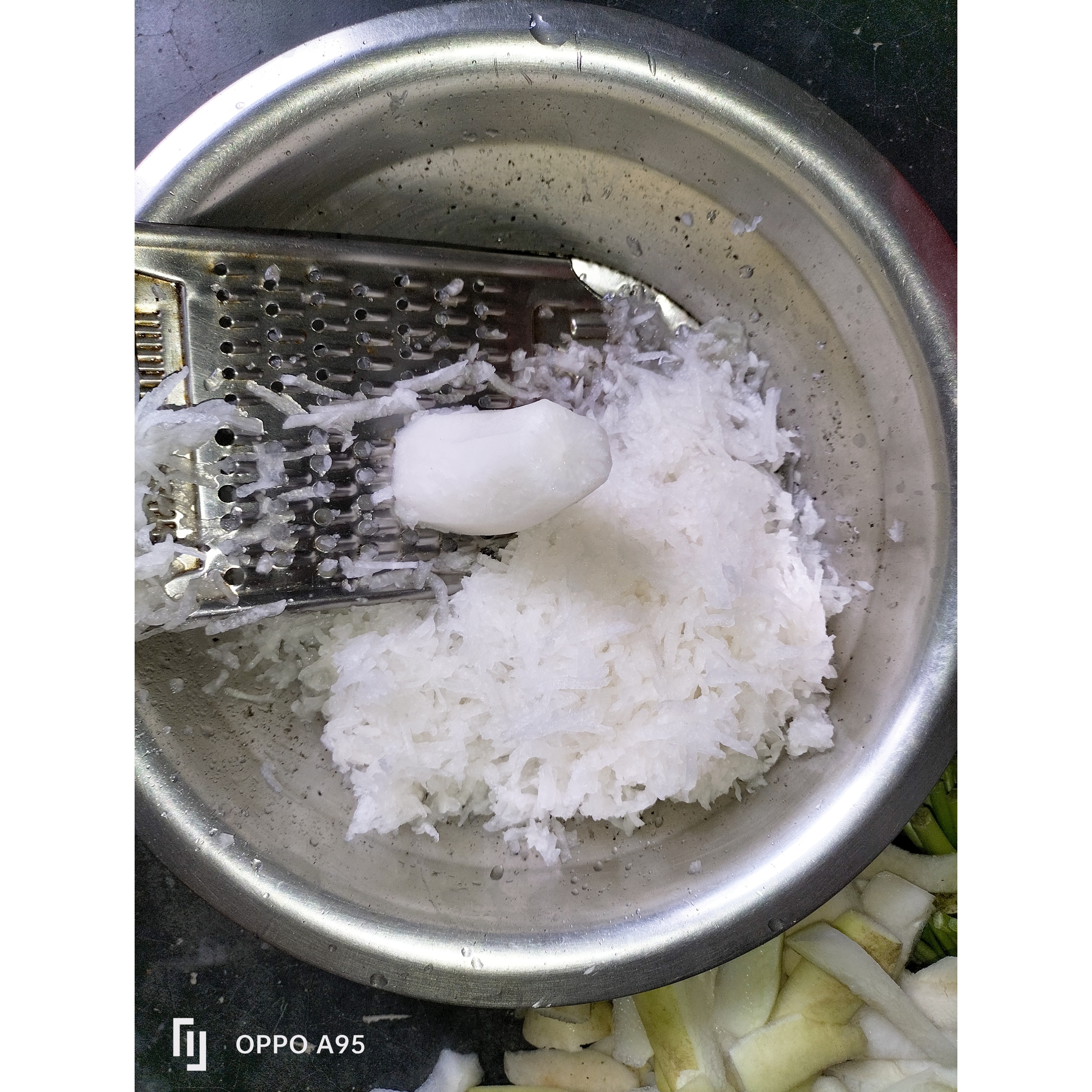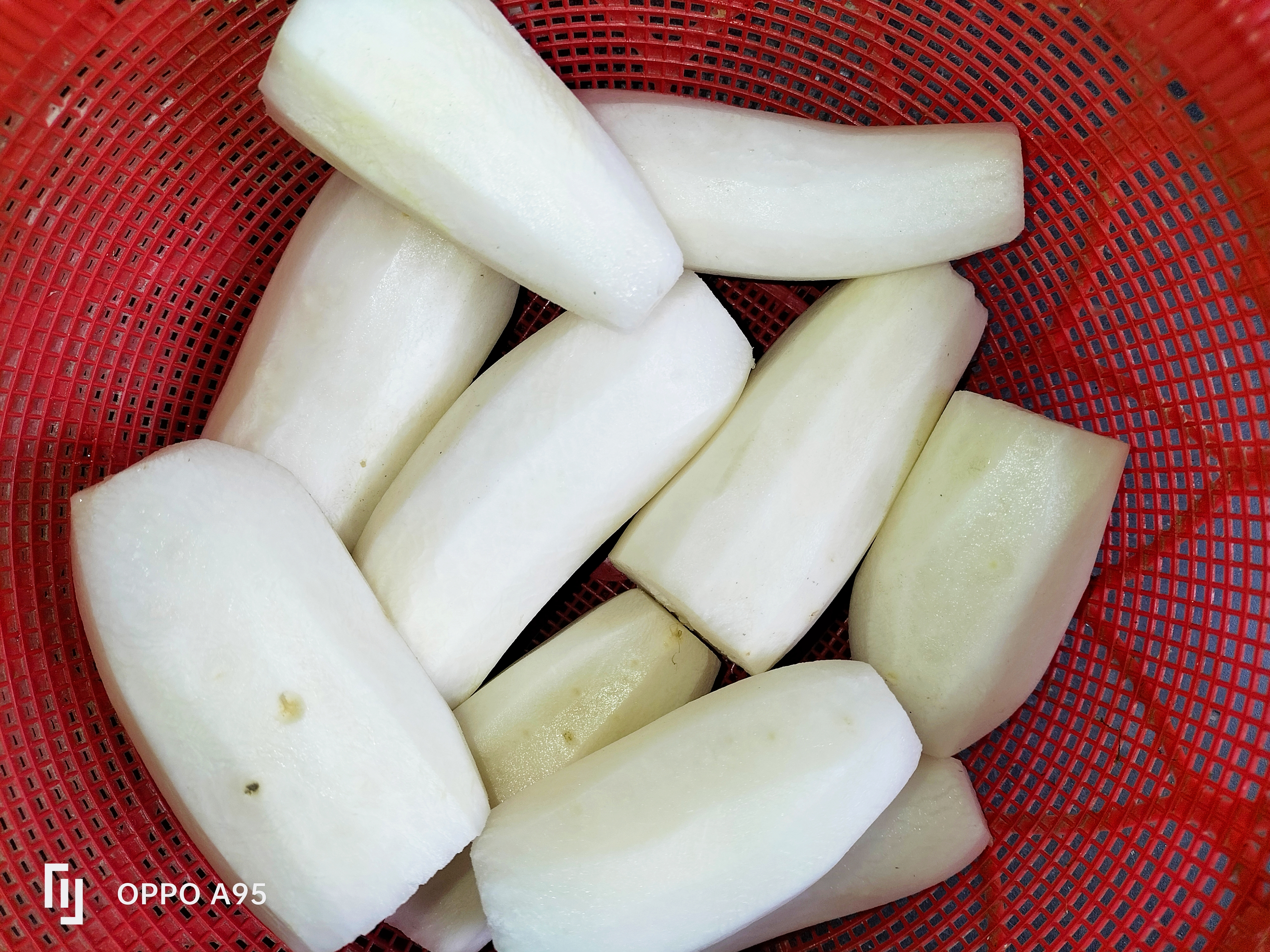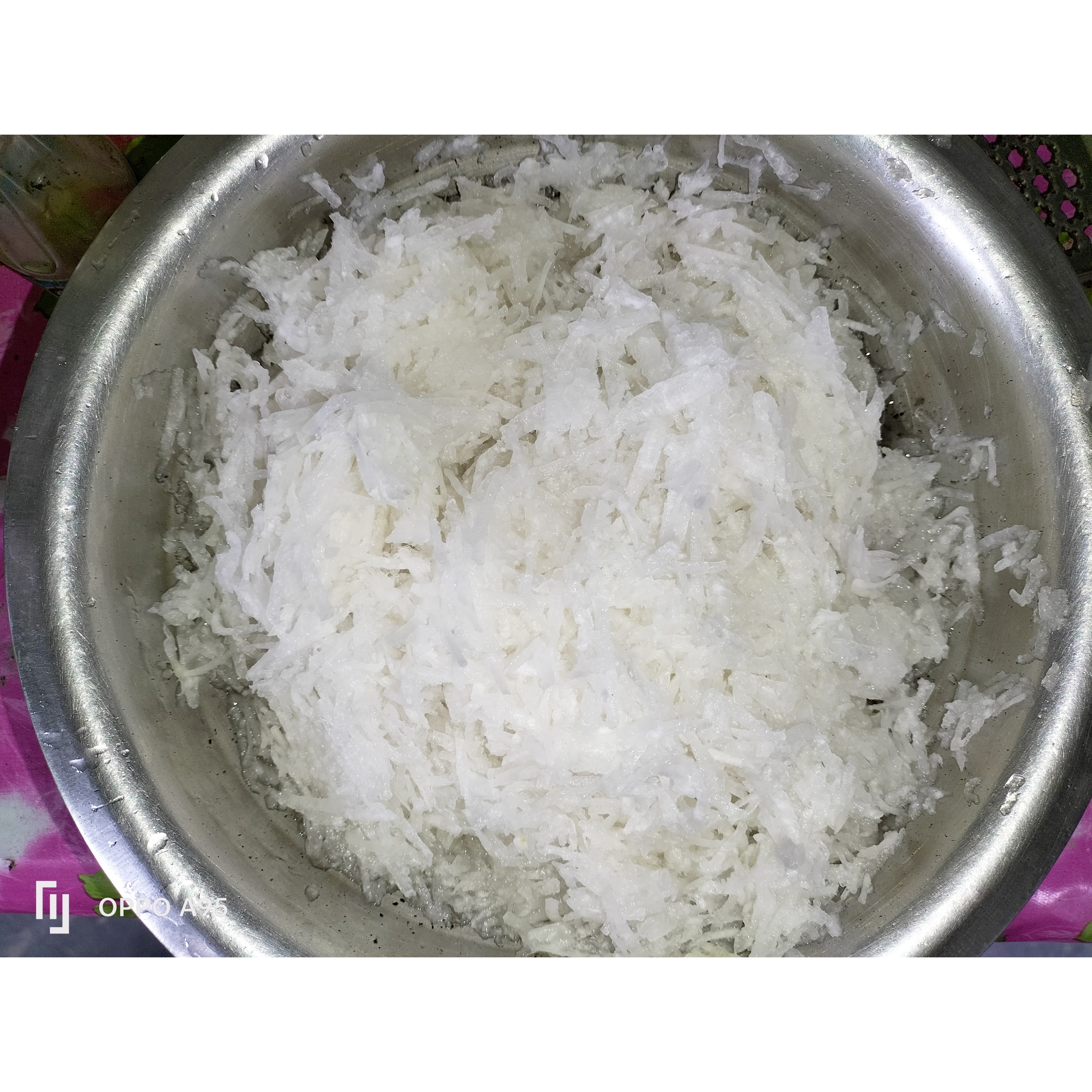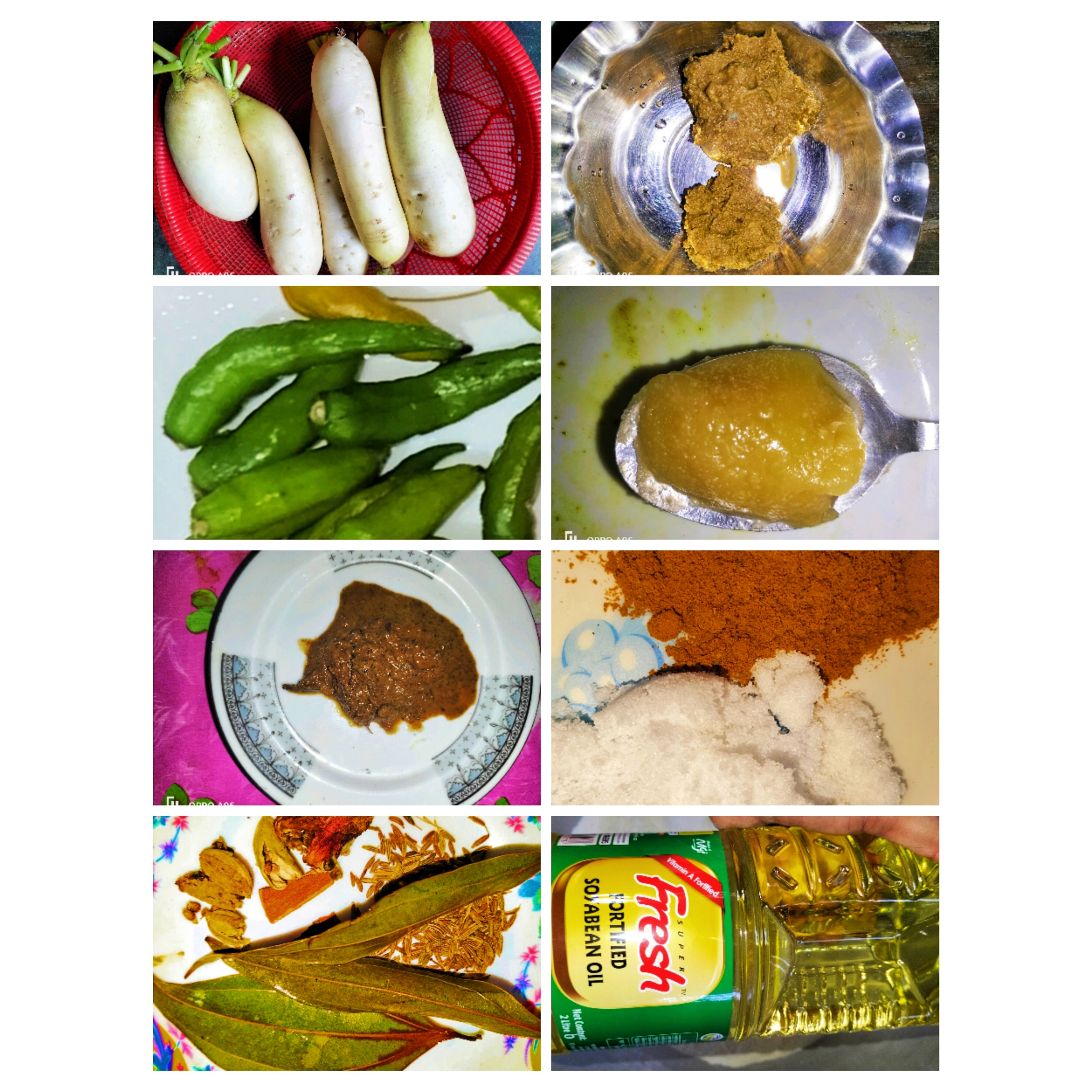 প্রথমে বড়ো সাদা মুলা গুলো ছিলে নিতে হবে এবং সালাদ কটারের সাহায্যে মূলা গুলো কুচি কুচি করে নিতে হবে।