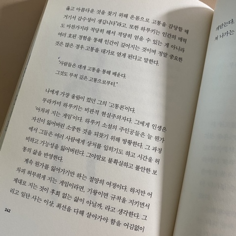 하루키의 '노르웨이의 숲'이 밀리언셀러가 될 때 쯤, 사람들의 부정적인 비평들에 상처를 입는 시간을 보내게 된다. 천하무적 멘탈일 것 같은 하루키도 스트레스를 받는다니 왠지모를 안도감이 들었지만, 결국 하루키는 어딘가 우직하고 단단한 그의 문체처럼 그의 방식대로 삶을 이어나간다. '비평가들은 내 소설을 무조건 읽어야하지만, 본인은 비평가들의 글을 무조건 읽지 않아도되서' 왜인지 이긴 기분이라나.