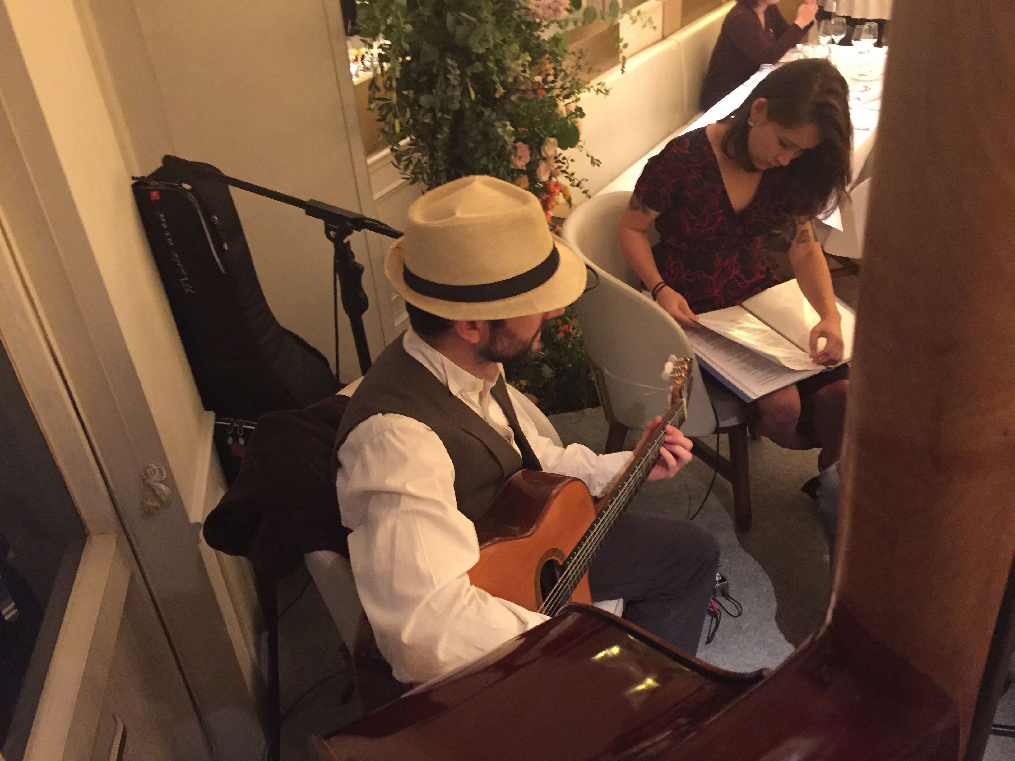 As I play more and more with different people, I start to notice more what works and what doesn’t. And I think for the gypsy jazz stuff, the bass needs to be pretty simple and each note as even as possible. If I start doing triplet fills, or deviate too long, it doesn’t seem to work. Probably cause the guitars are hitting every quarter note, there’s not much room for over playing.