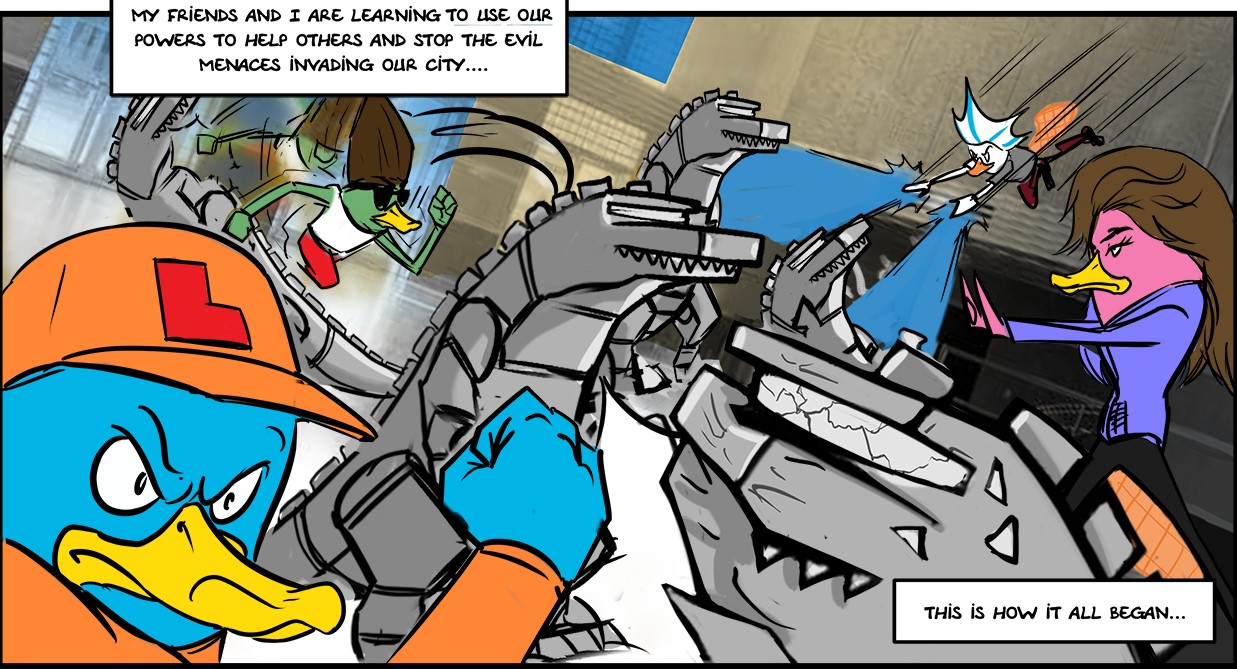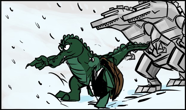Since the music will accompany art in the digital comic, we composed this song based on a particular scene we outlined where an army of Croc-Bots march into the city, then, the battle begins.