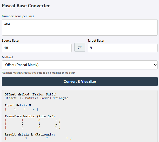 - The first method converts between bases offset by N (e.g., base 10 to base 9) by multiplying a number matrix by Pascal's Triangle raised to the ±N power.