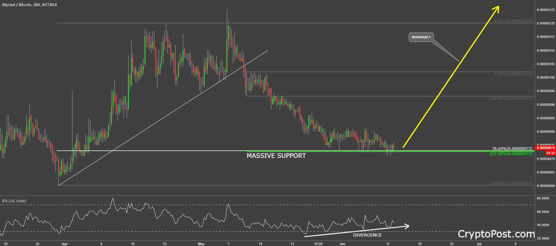 The Myriad has found the support at 73 satoshis, which is a very cheap price in relation to most coins out there. The support is confirmed by two Fibonacci retracement levels. Fist is 327.2% Fibs applied to the corrective wave up after the uptrend trendline breakout. And second is 78.6% retracement of the previous wave up.