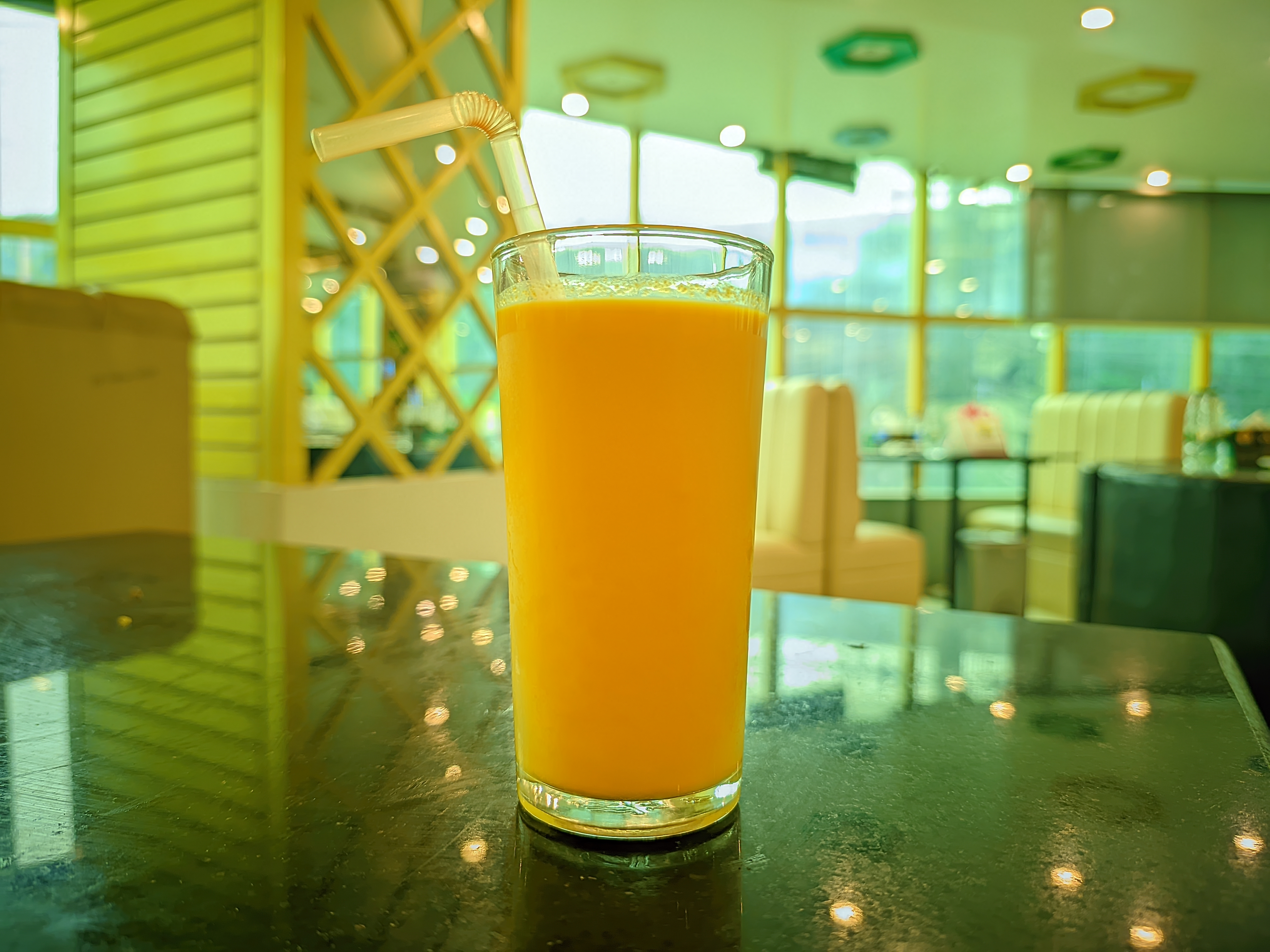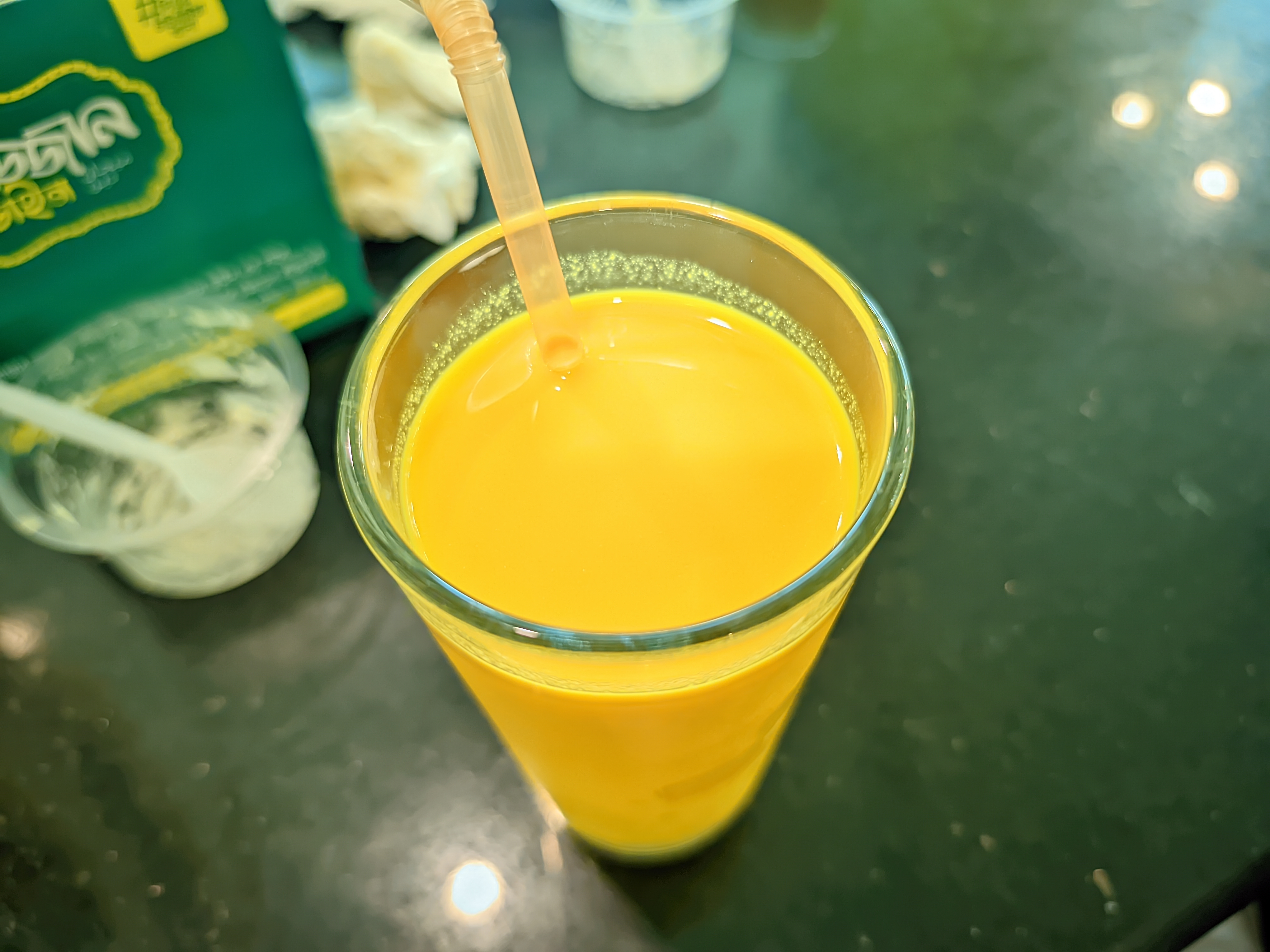 Anyway, we finished eating. After finishing, there was a discussion among us about what to drink—whether to have plain fresh water or some kind of juice or something similar. Then some of us suggested drinking Borhani or almond juice, so we ordered almond juice, and the almond juice arrived.